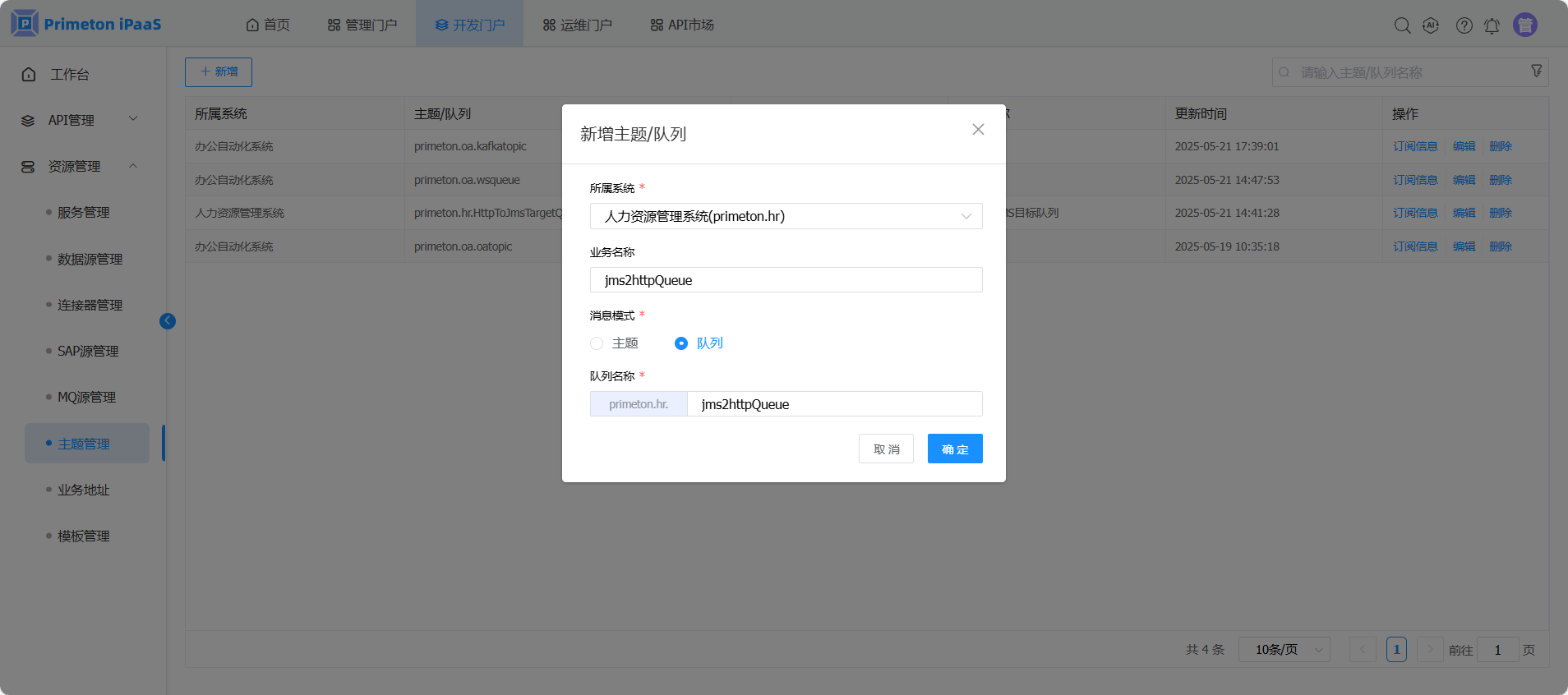点击“新增”按钮弹出新增队列窗口,参考字段说明,填写消息队列信息,点击“确定”按钮保存数据。