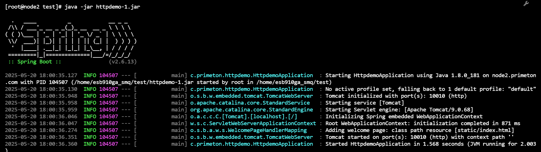 本次我们使用的业务服务为httpdemo-1.jar,打开方式为在命令行下面输入