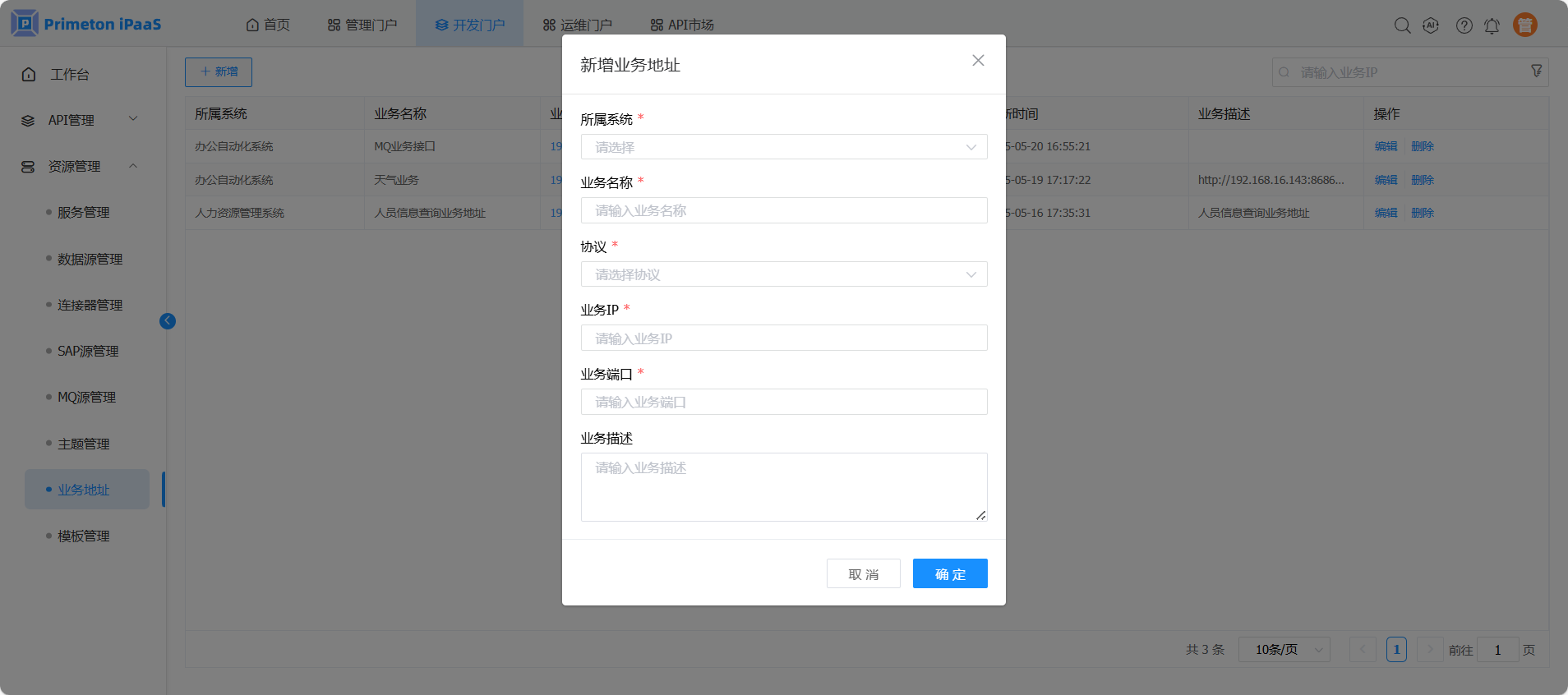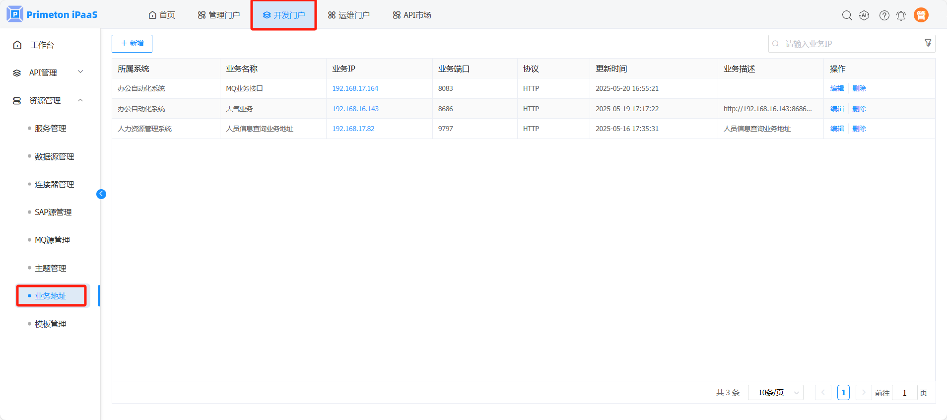 使用manager账号(默认密码:000000)登录系统,点击开发门户,进入"资源管理">"业务地址"页面,
