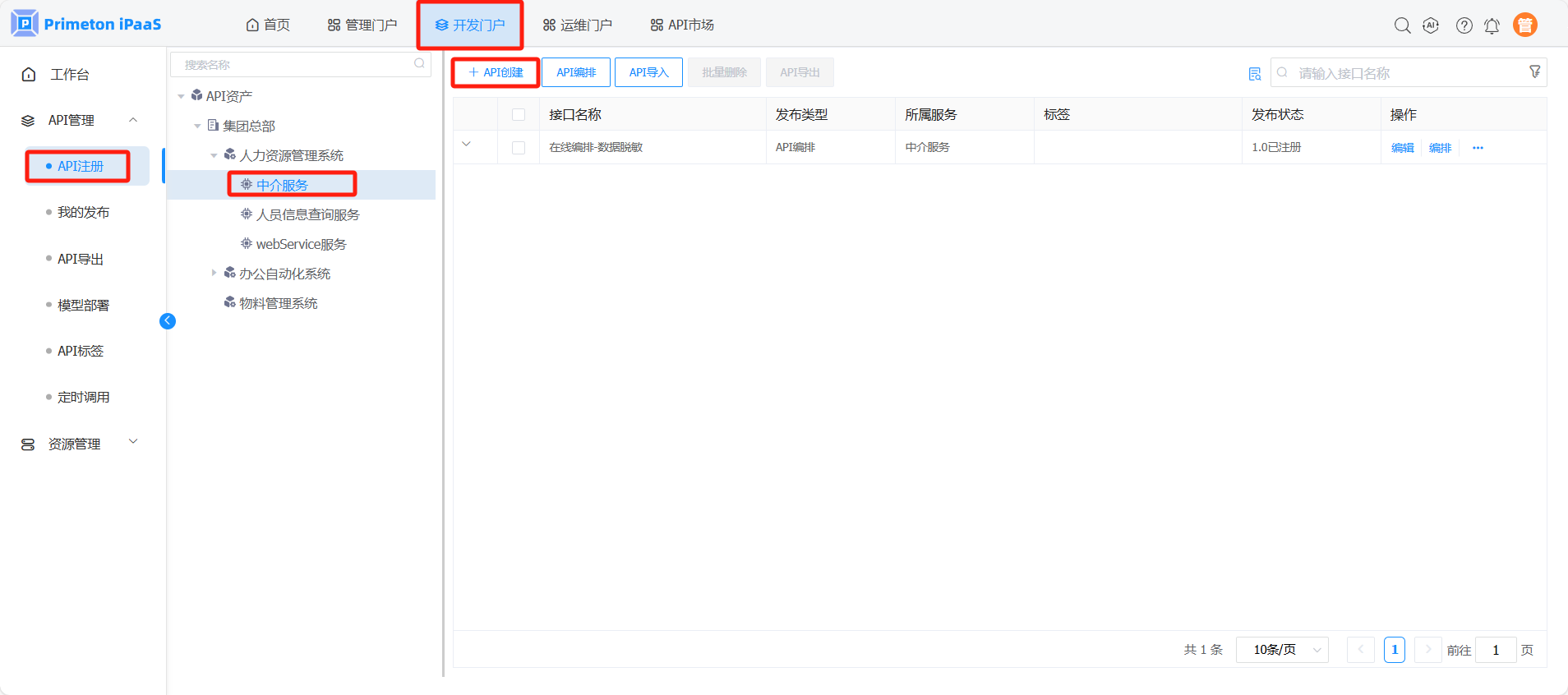 使用manager账号(默认密码:000000)登录系统,点击开发门户,进入“API管理”>“API注册”页面。在左侧资源树选择“中介服务”项,右侧界面点击“API创建”按钮,弹出“API创建”页面。