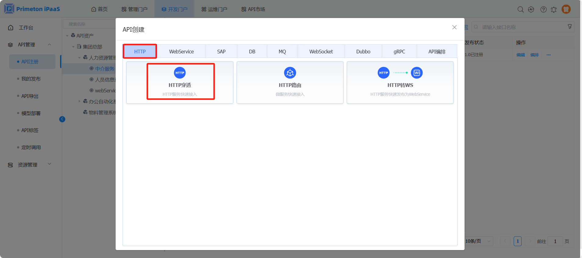 在“API创建”页面,点击“HTTP”页签,选择“HTTP穿透”类型。