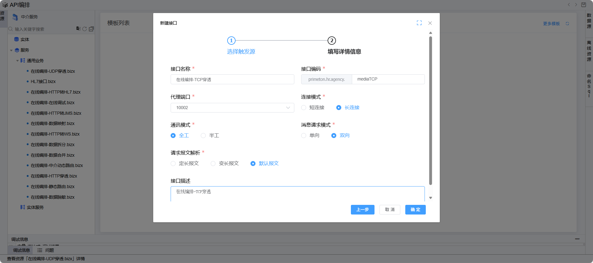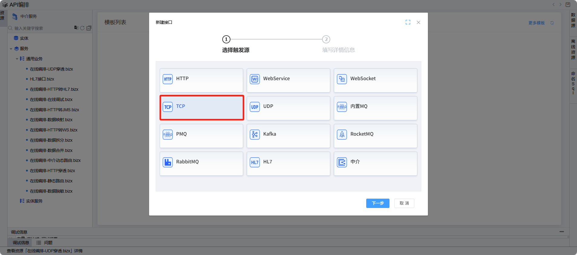 在“新建API接口”页面,选择“TCP”选项,并点击“下一步”按钮,进入接口信息填写页面。