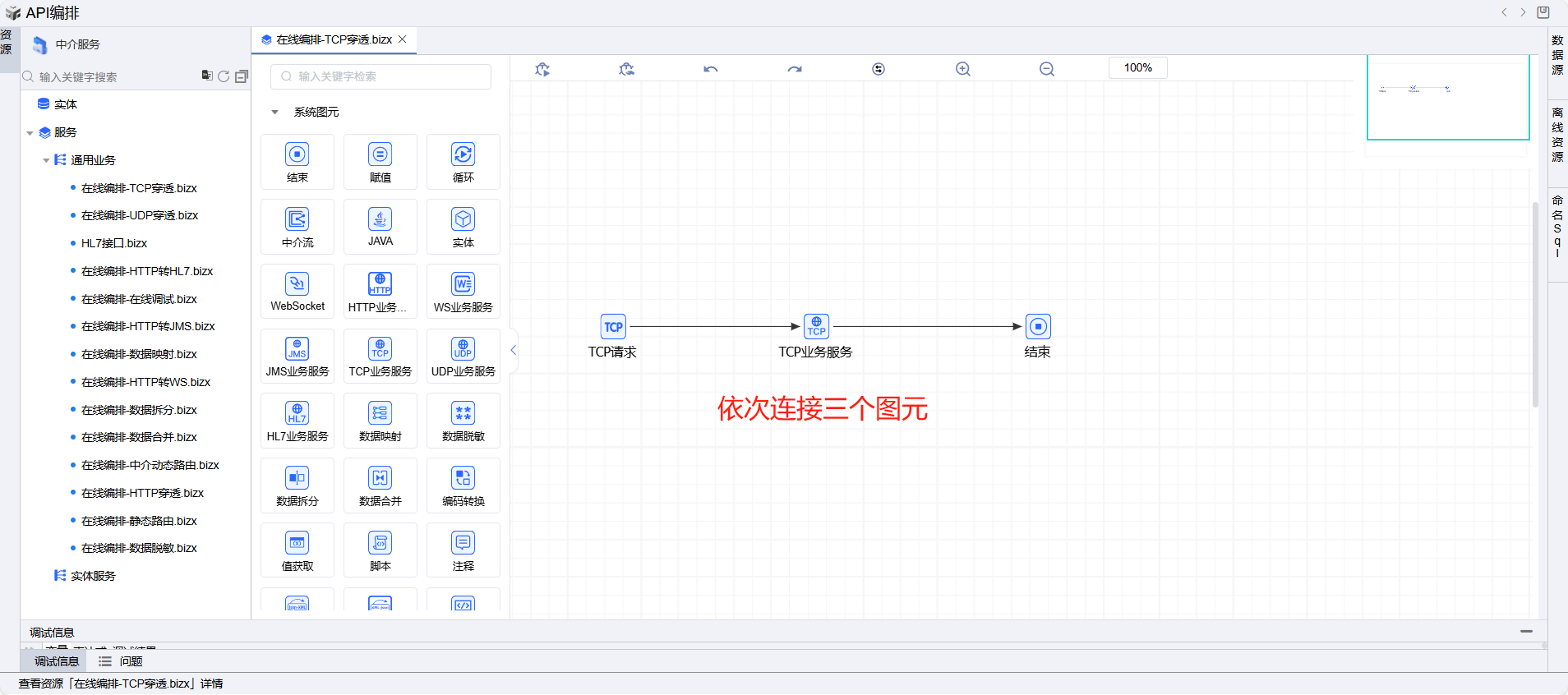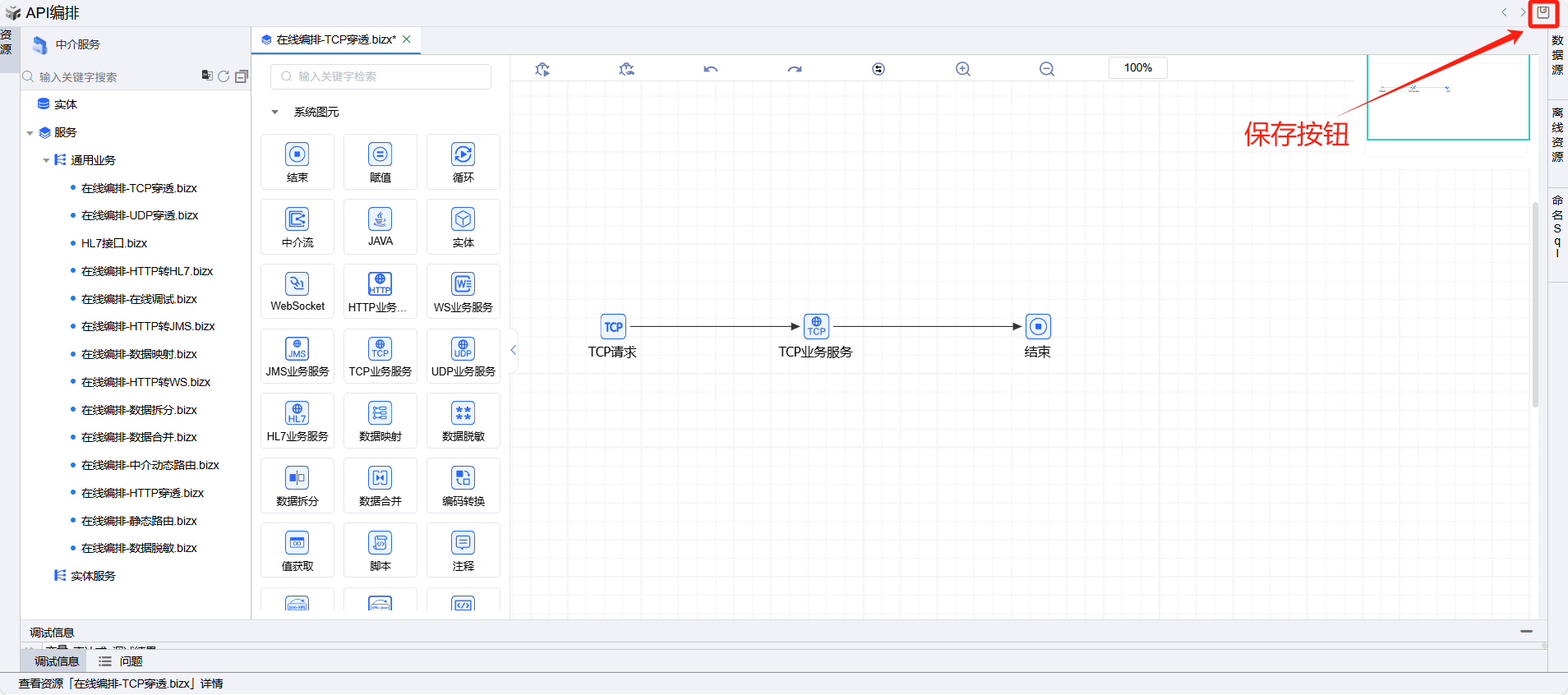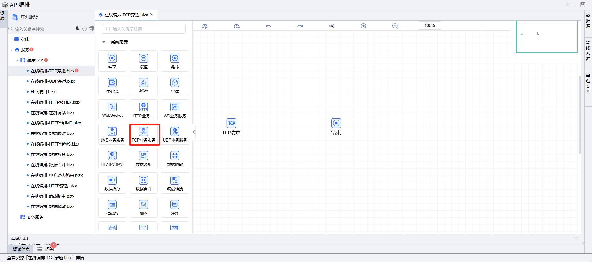 保存成功后系统自动打开中介编排页面。从左侧拖一个TCP业务服务图元到编辑区域。