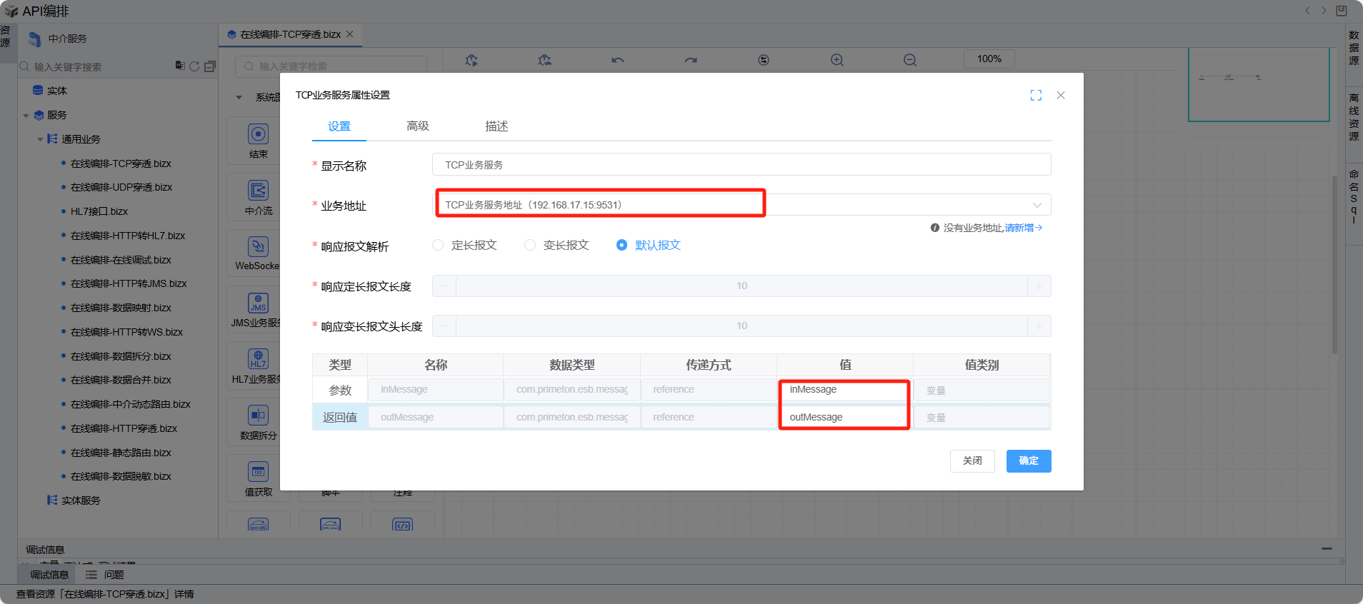 双击打开TCP业务服务图元,业务地址下拉框选择中介TCP业务服务地址,其他参数保持默认即可,下方表格中的参数和返回值分别选择inMessage和outMessage,然后点击确定按钮关闭对话框。如下图:
