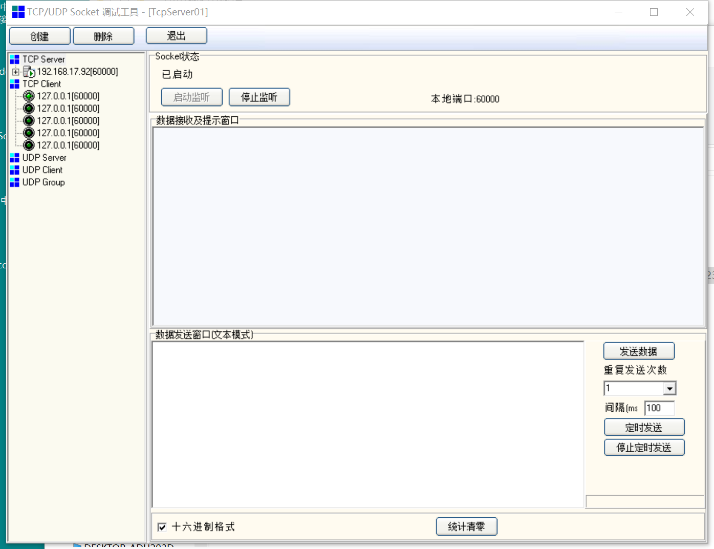 点击新建的UDP Server,取消下方的十六进制格式的复选框,这样就可以收发中文。如下图: