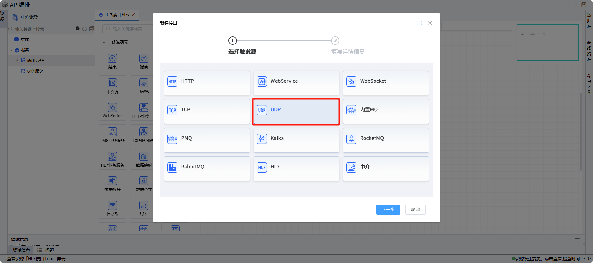 在“新建API接口”页面,选择“UDP”选项,并点击“下一步”按钮,进入接口信息填写页面。