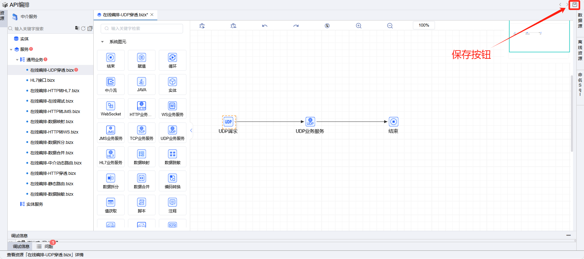 保存成功后系统自动打开中介编排页面,如下图所示。从左侧拖一个UDP业务服务图元到编辑区域。
