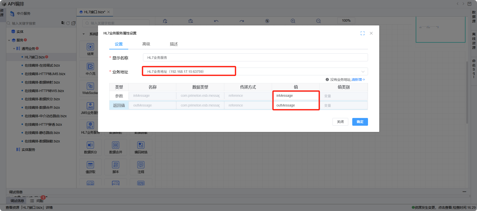 双击打开 HL7业务服务 图元,业务地址下拉框选择 HL7业务地址,其他参数保持默认即可。下方表格中的参数和返回值分别选择inMessage和outMessage,然后点击确定按钮关闭对话框。如下图: