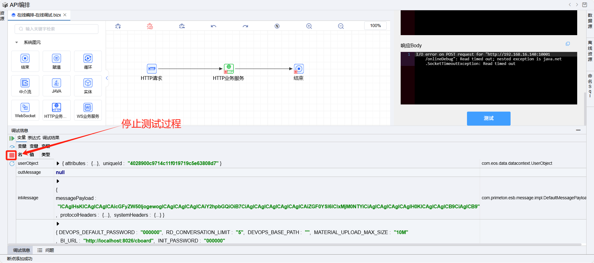 点击测试后,可以看到在线编排页面,已经来到第一个断点,可在“变量”界面查看当前变量信息。