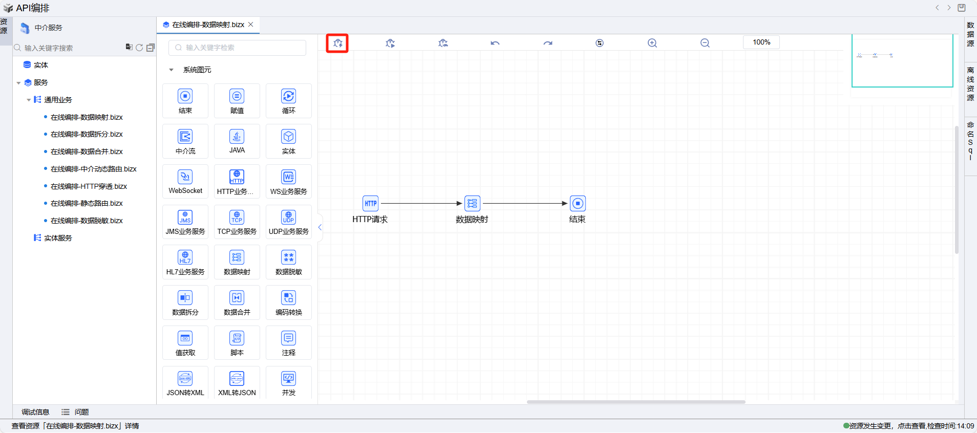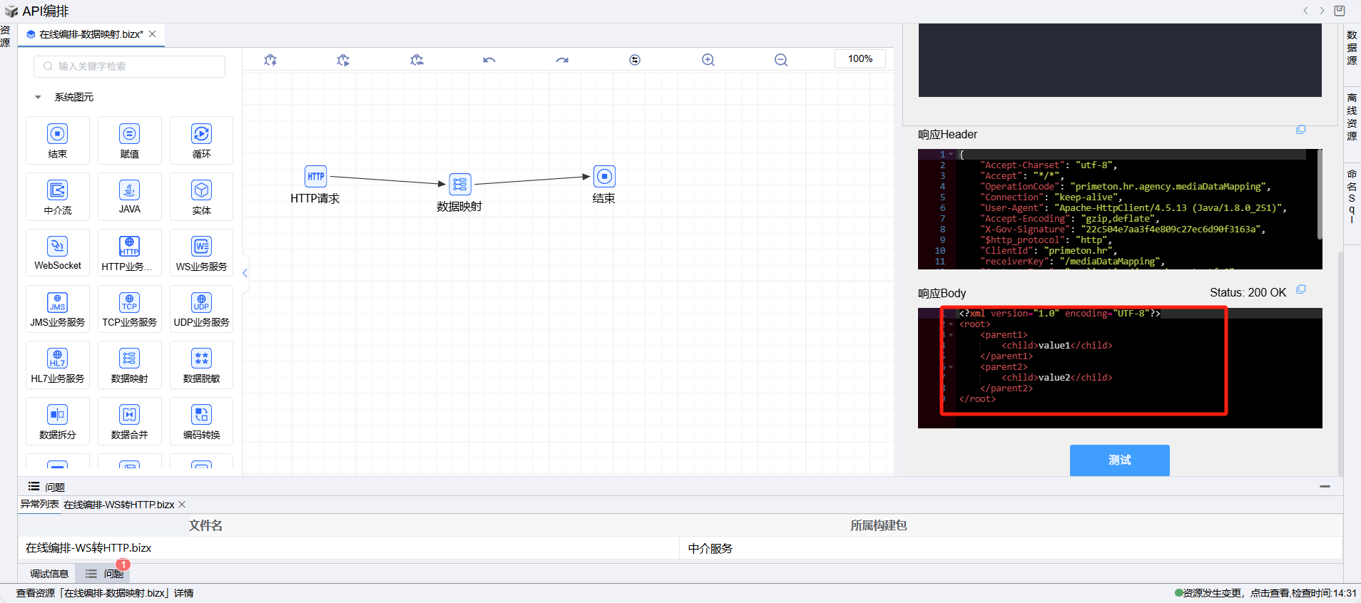 在线编排页面保存成功后,点击界面上方的测试按钮,如下图: