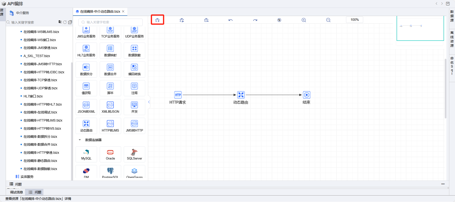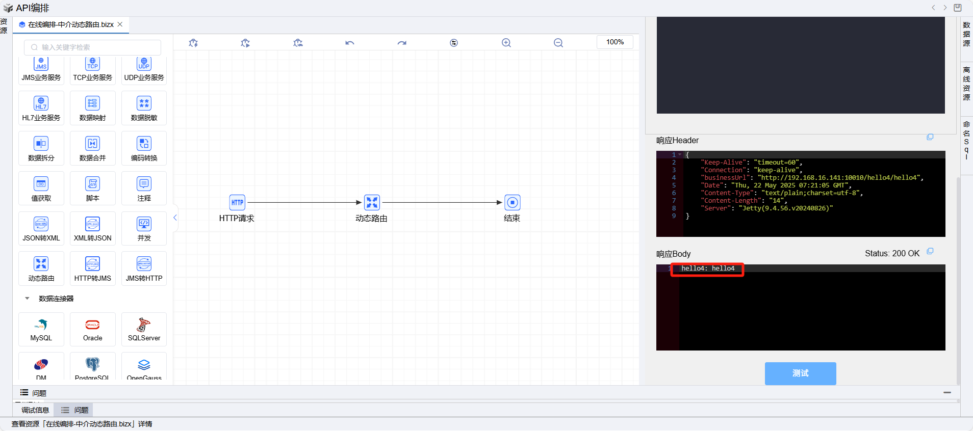 在线编排页面保存成功后,点击界面上方的测试按钮,如下图: