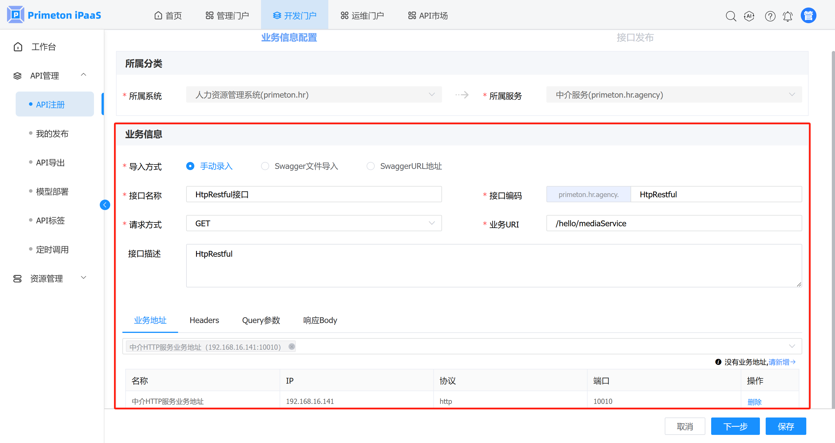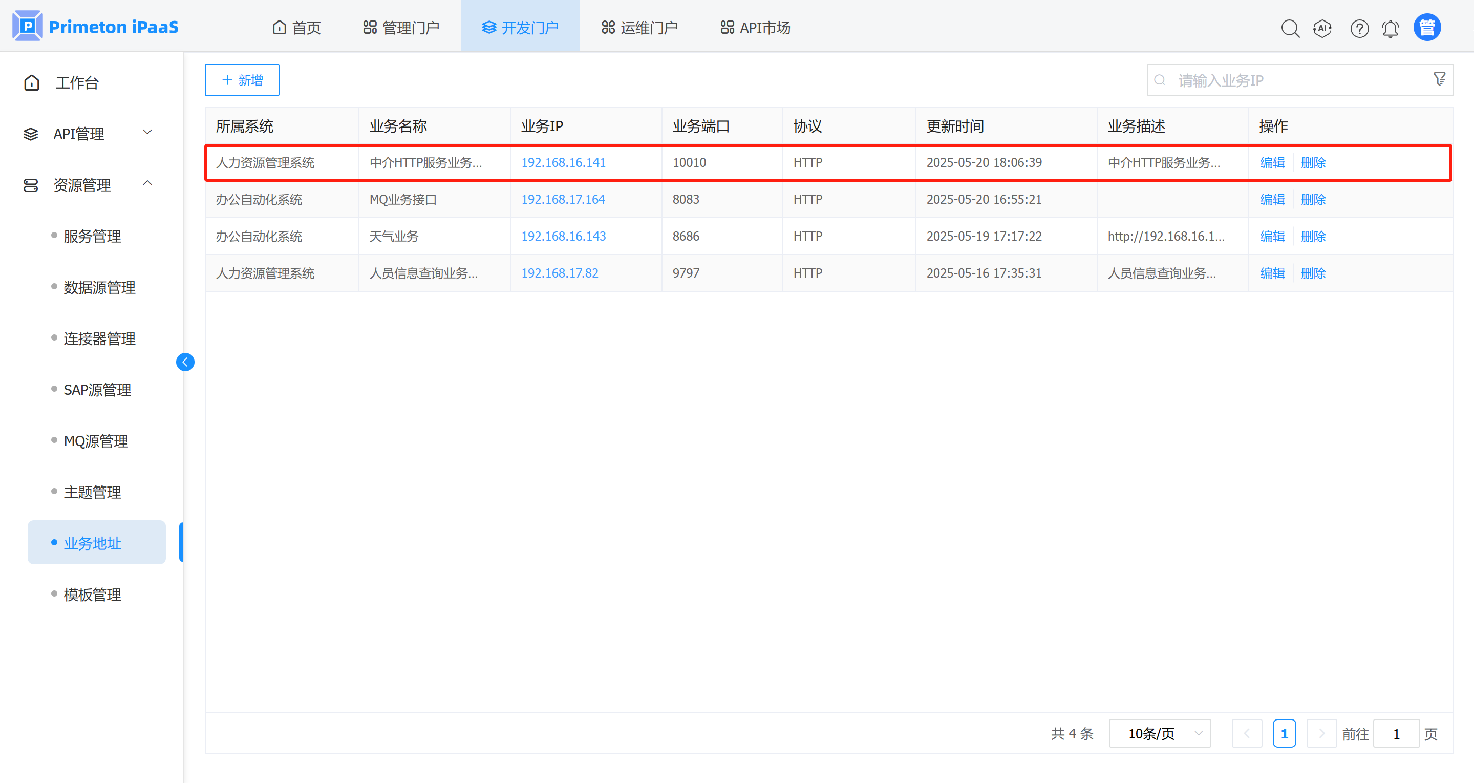 java -jar httpdemo-1.jar。在【资源管理】/【业务地址】页面,新增业务服务地址并点击确定保存。如下图: 业务IP和业务端口分别填写运行Jar的服务器的ip和端口10010