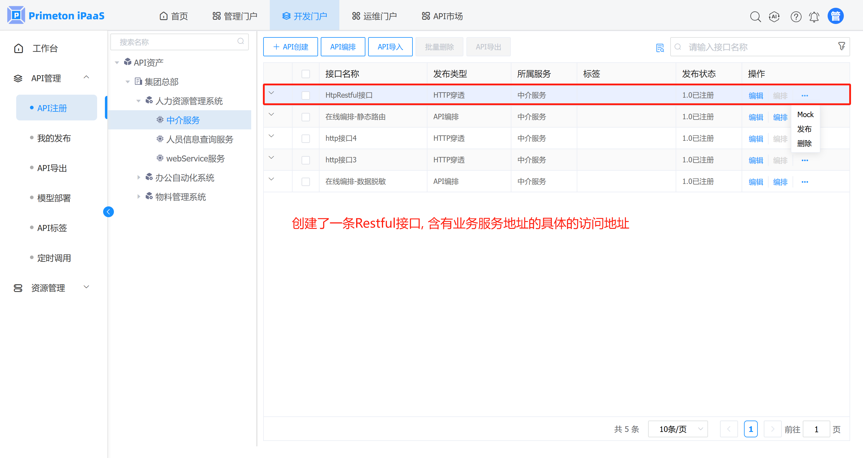 在中介服务下添加这个地址的具体访问URL。点击中介服务后点击右侧的API创建。如下图: