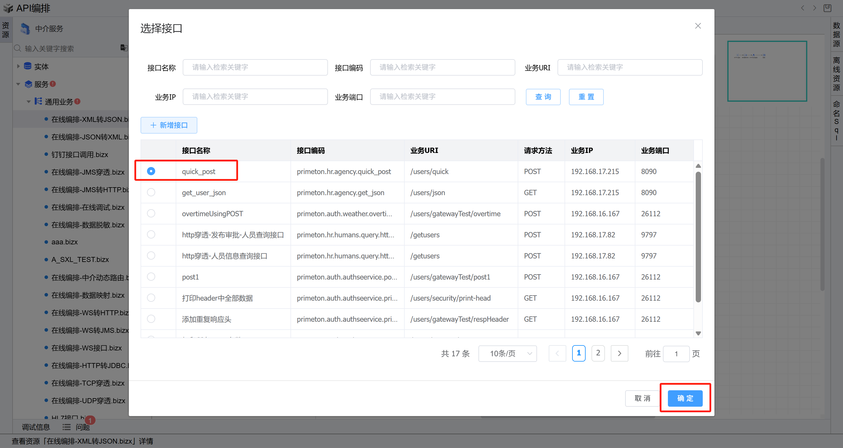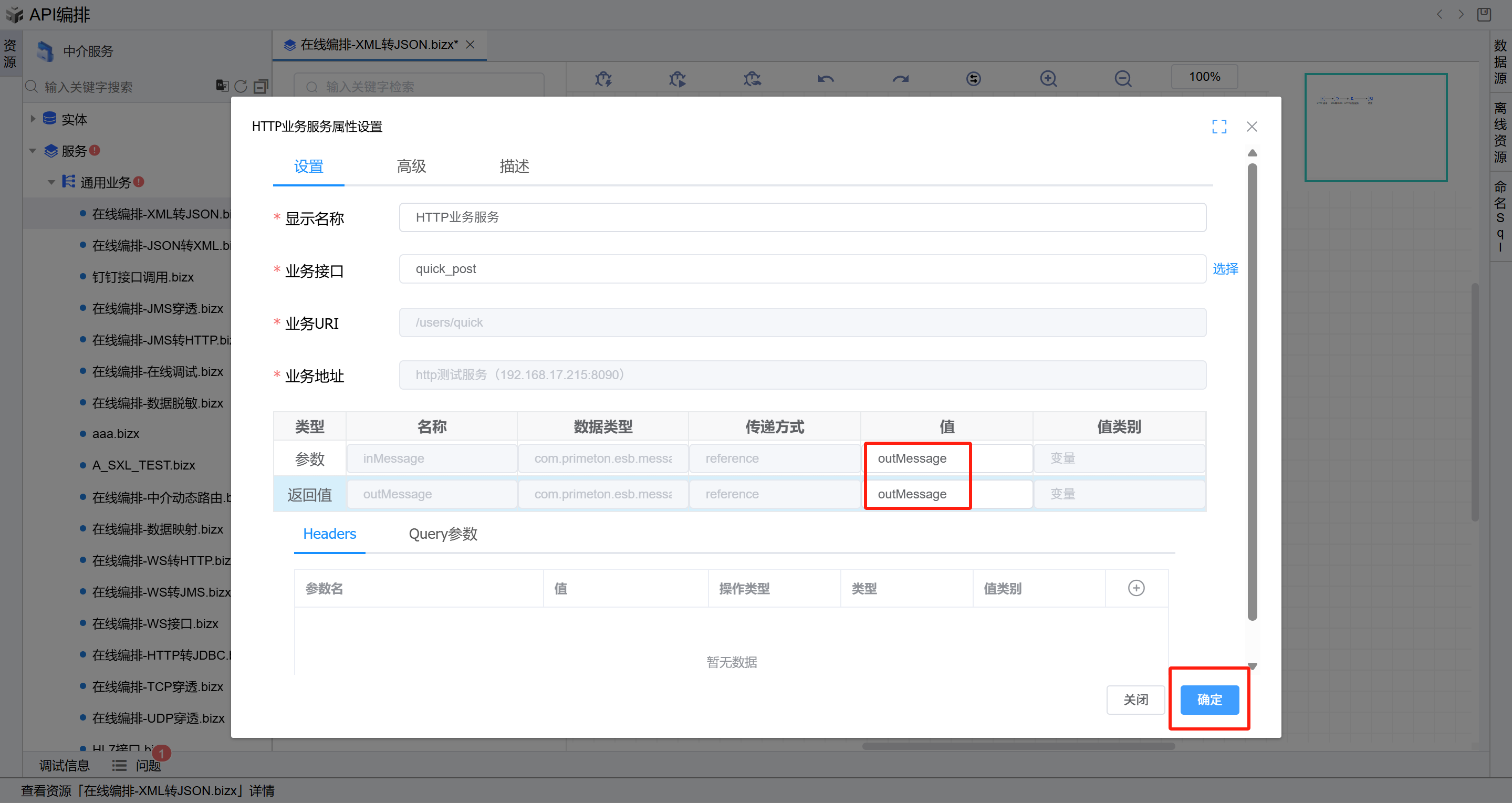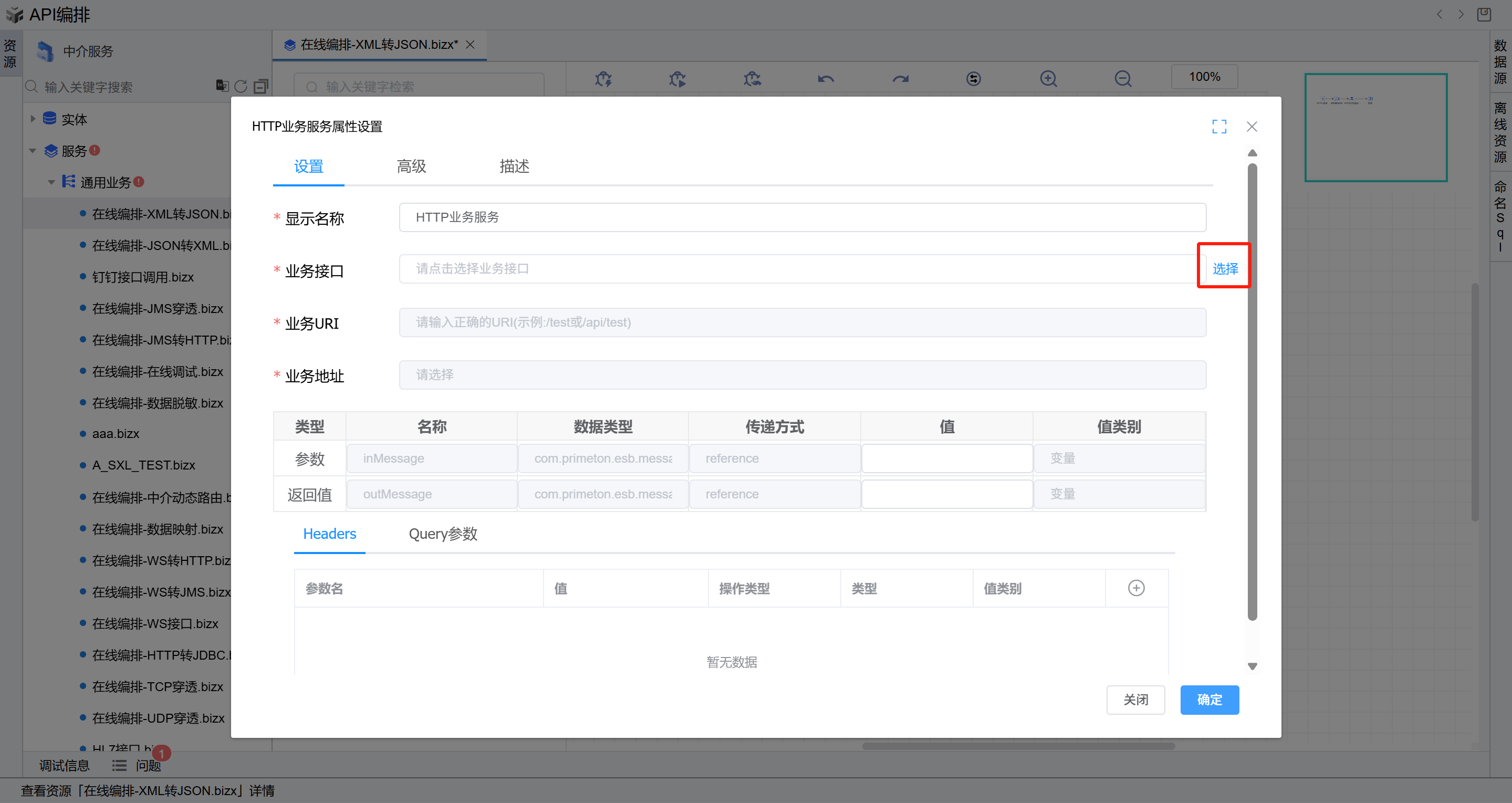 双击打开第二个HTTP业务服务图元,在业务接口右侧,点击选择按钮,在弹出的选择接口页面选择前置条件中新增的接口,然后点击确定。然后回到HTTP业务服务图元, 参数选择