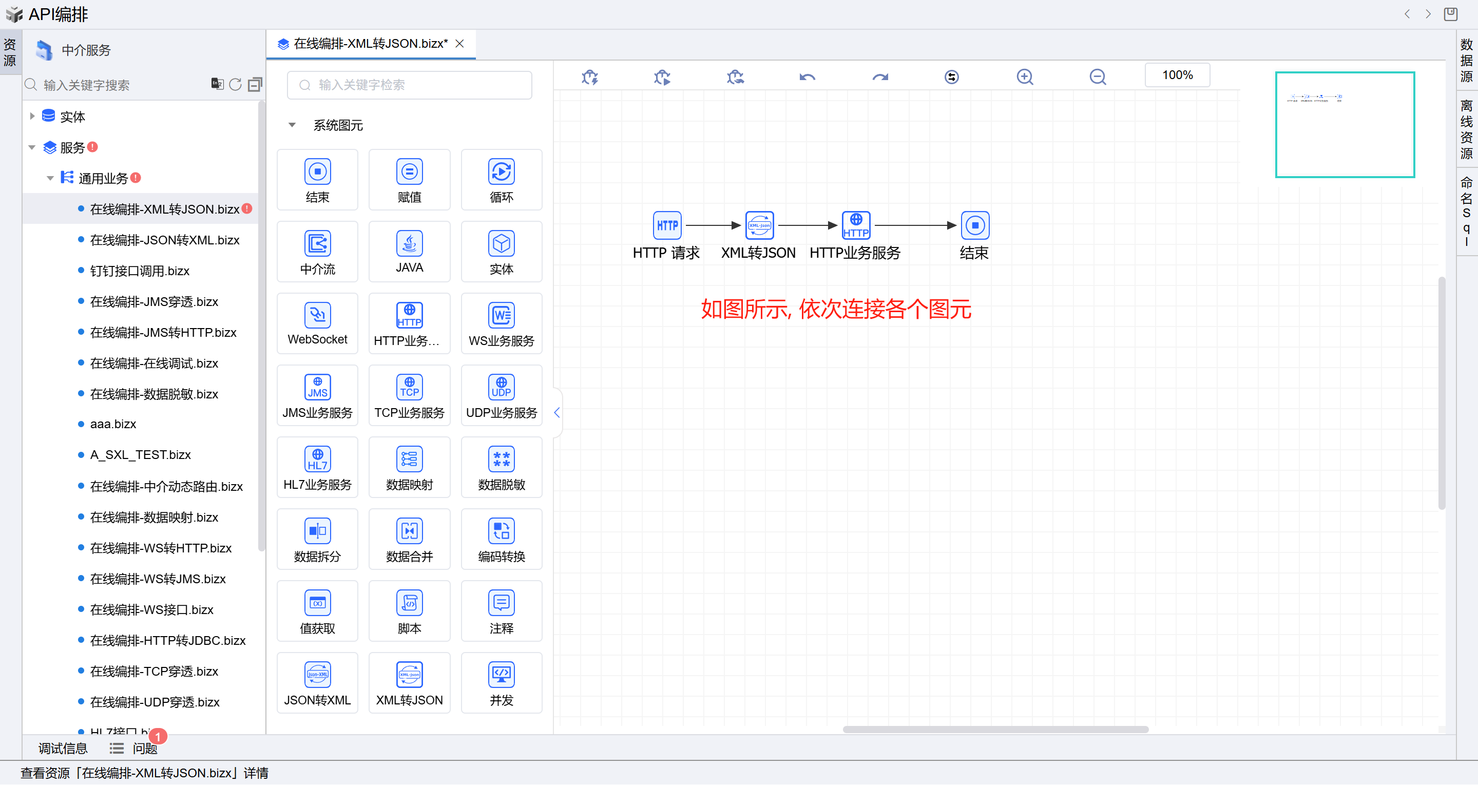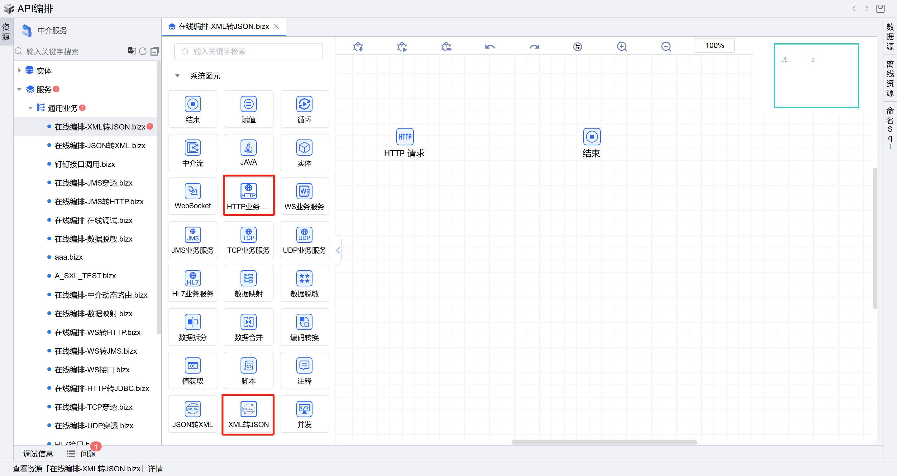 保存成功后系统自动打开中介编排页面,如下图所示。从左侧拖一个HTTP业务服务图元和一个XML转JSON图元到开始和结束图元中间并依次连接各个图元。如下图: