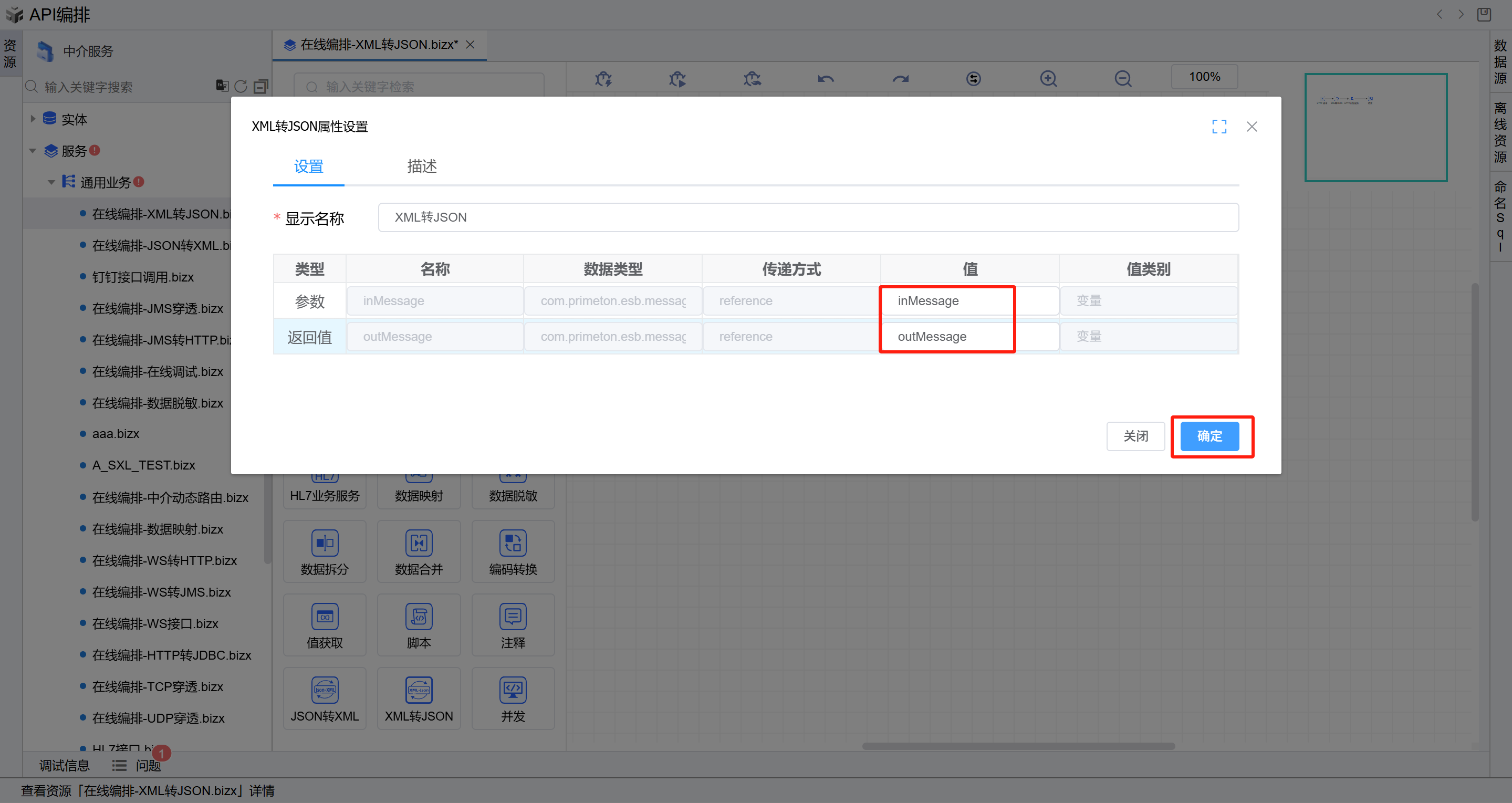 双击打开第一个XML转JSON图元,参数选择