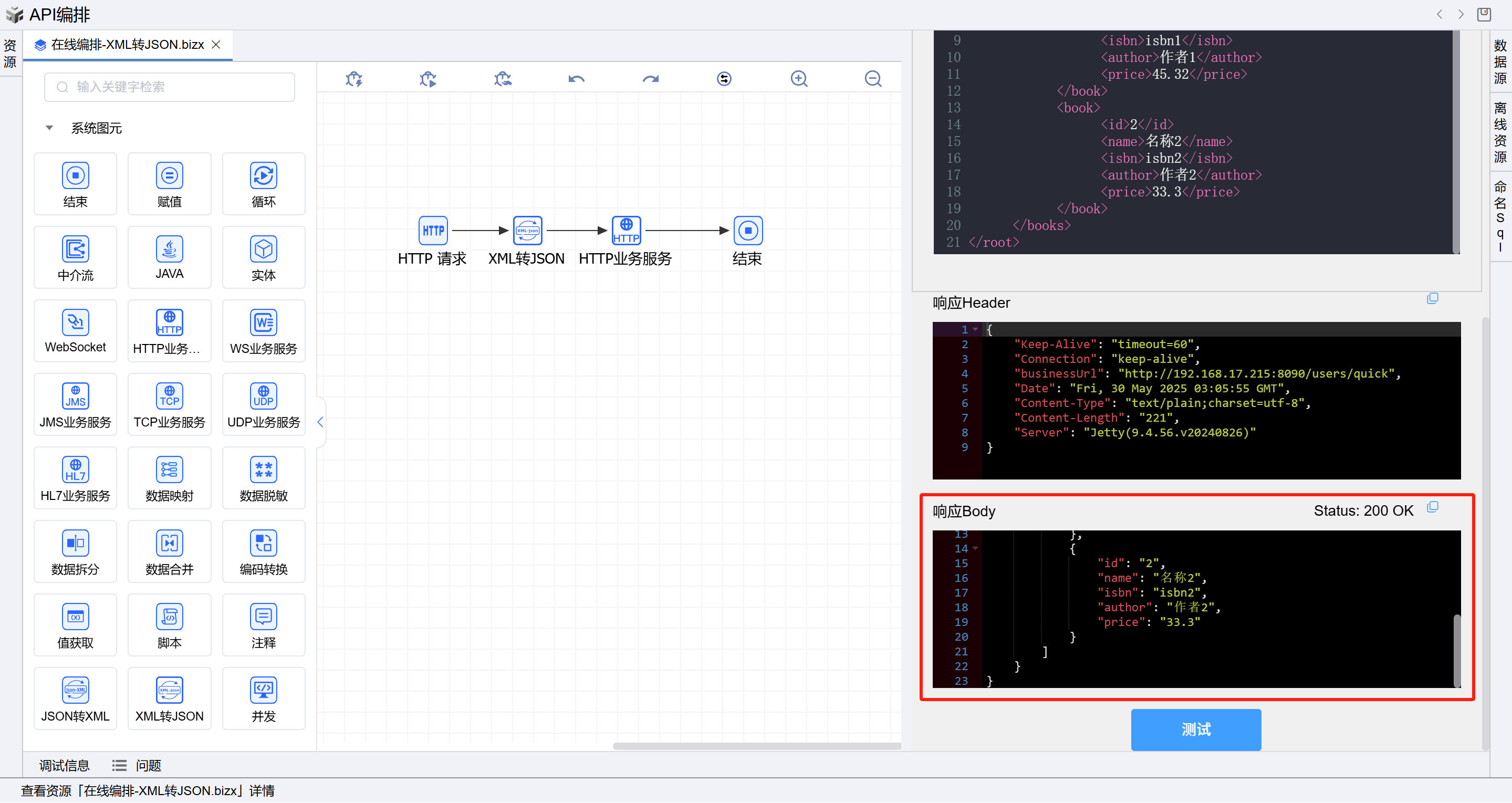- 在线编排页面保存成功后,点击界面上方的测试按钮,如下图: