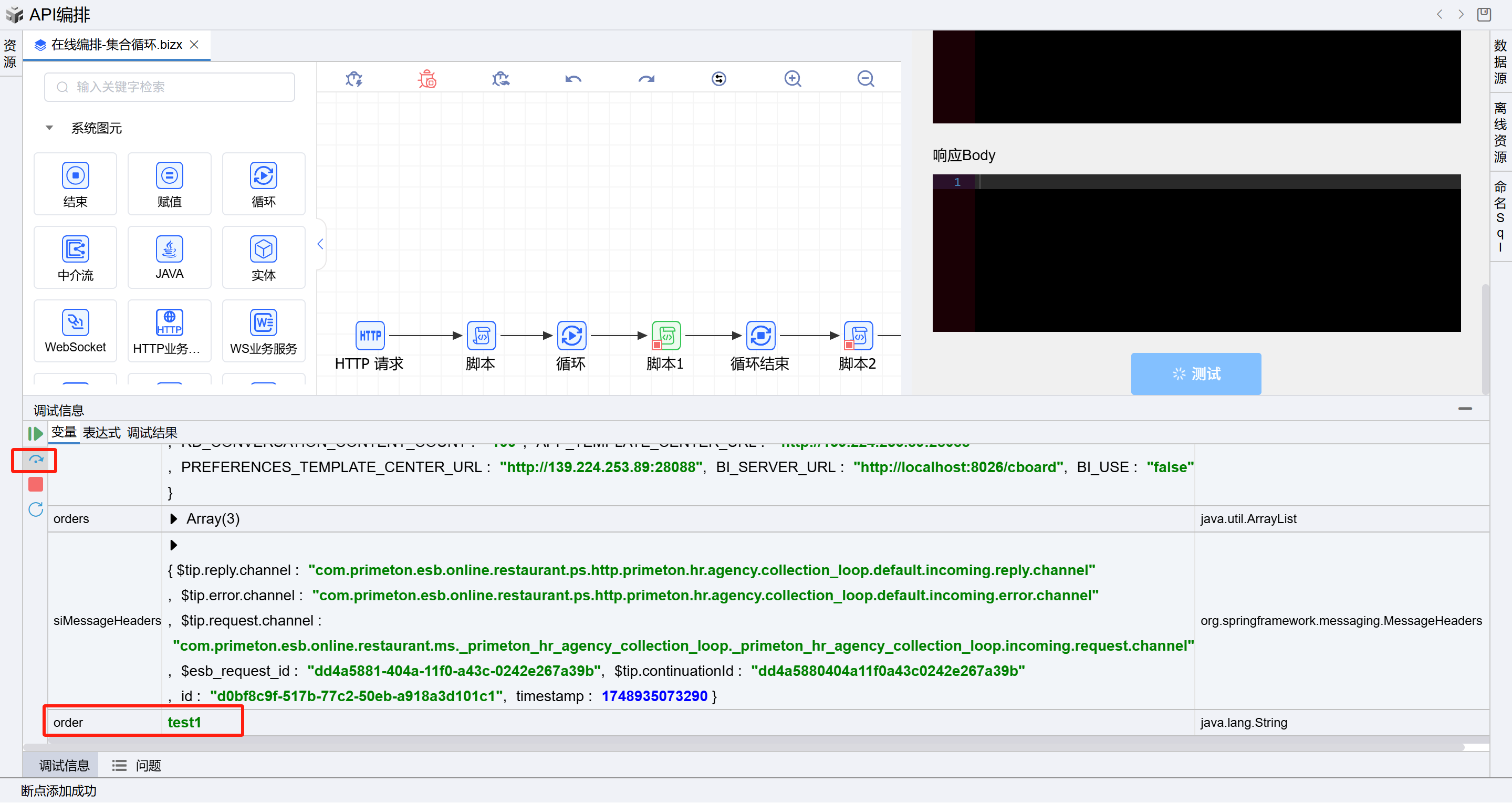 点击测试按钮后,在调试器中可以看到断点在第二个脚本处停住(第二个脚本图元位于循环开始图元和循环结束图元之间,此时脚本图元处于循环中,可以打印循环变量),点击“单步”按钮,可看到