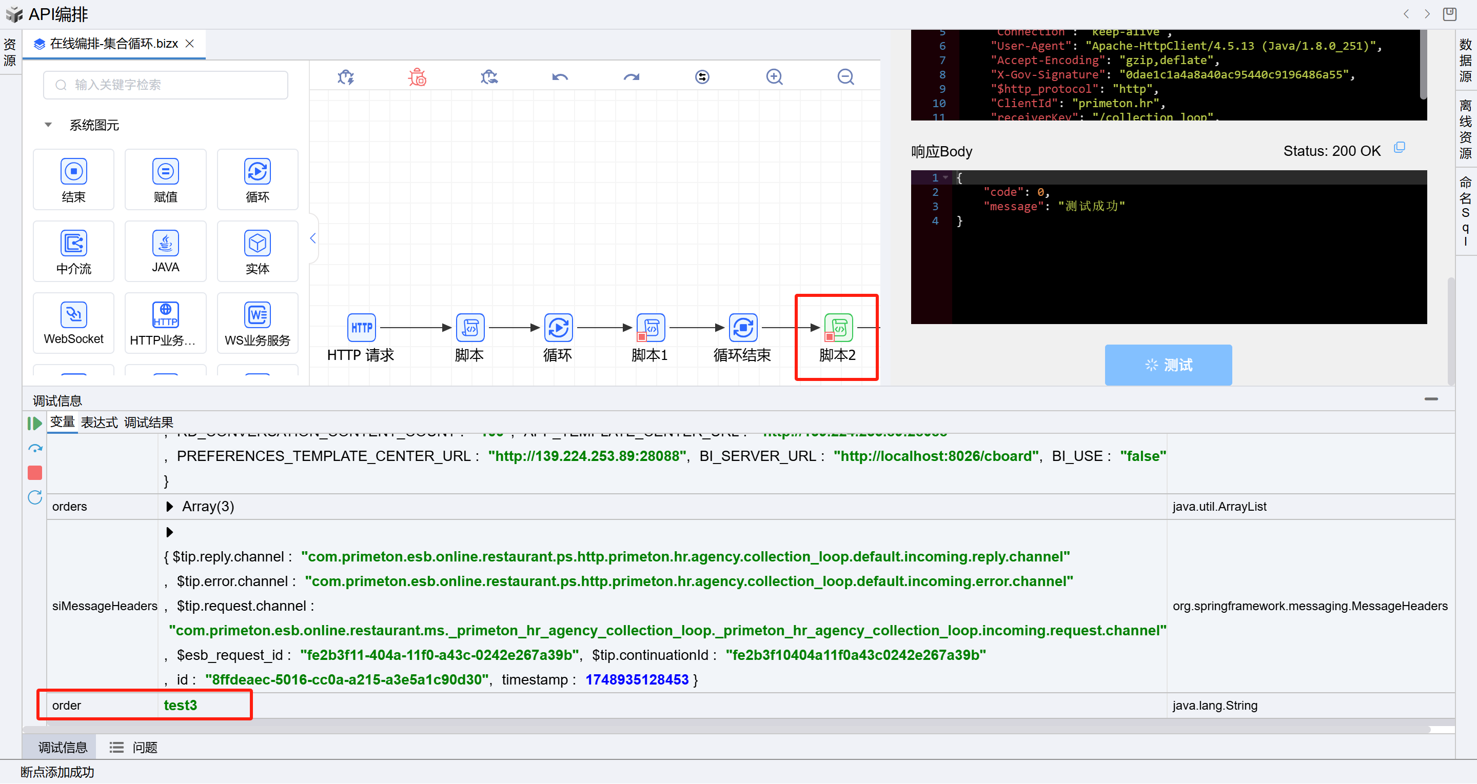 所有断点成功执行后,可看到接口返回第三个脚本构建的响应信息,如下图: