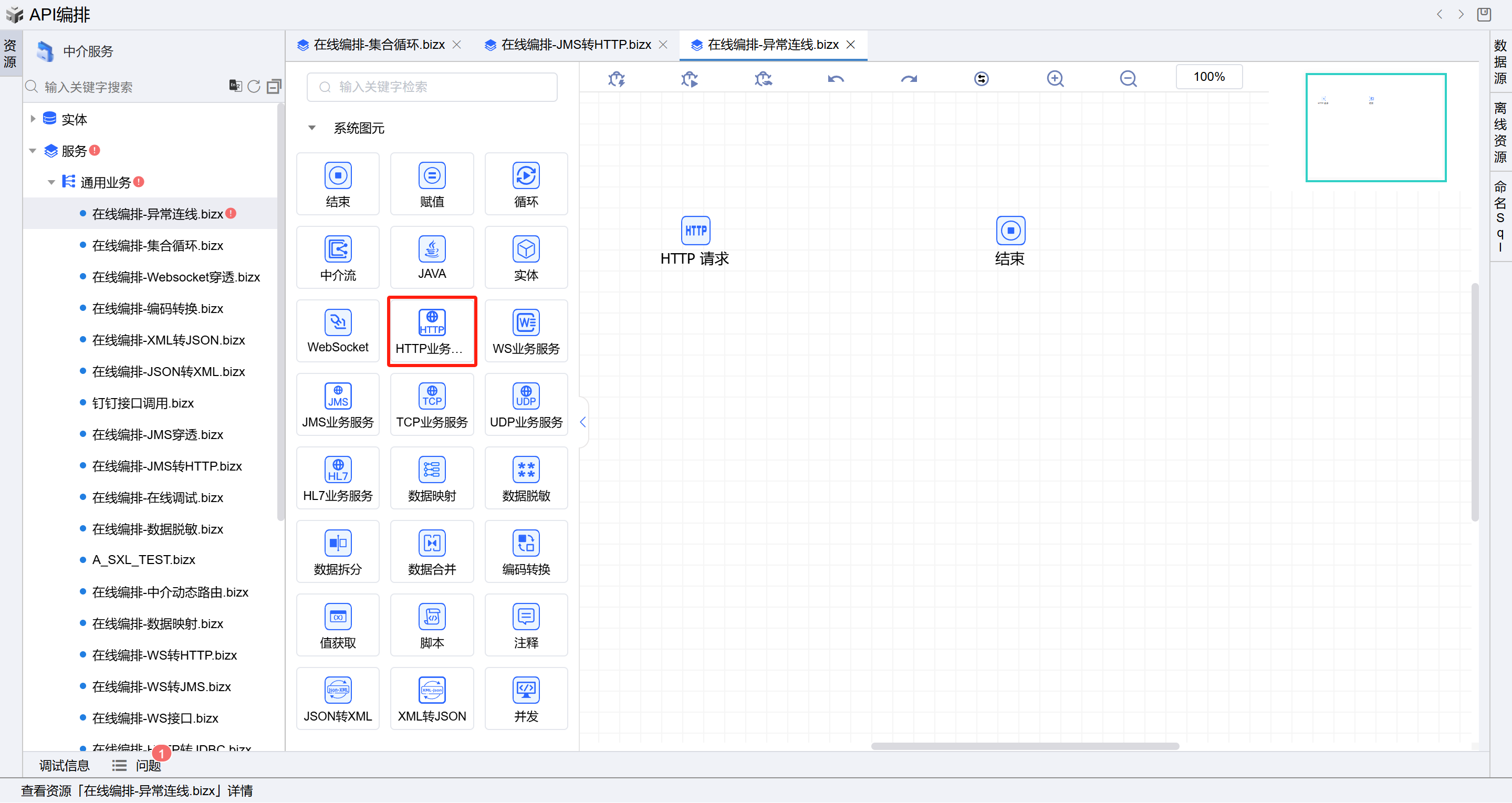 - 保存成功后系统自动打开中介编排页面,如下图所示。从左侧拖三个HTTP业务服务图元(顺序如下图所示)到开始和结束图元中间并依次连接各个图元。如下图: