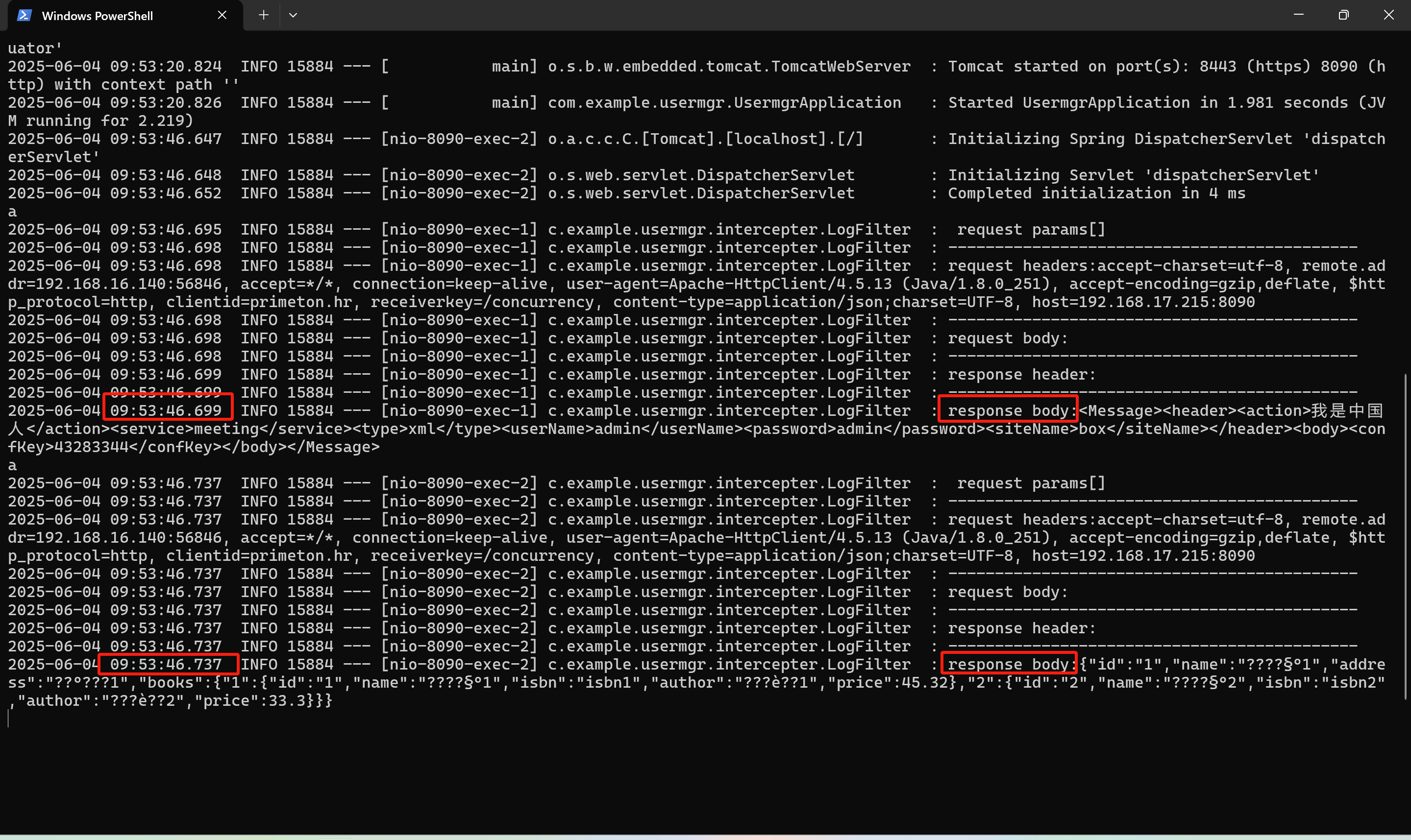 1. 查看服务日志,可以看到两个接口调用成功的日志。如下图: