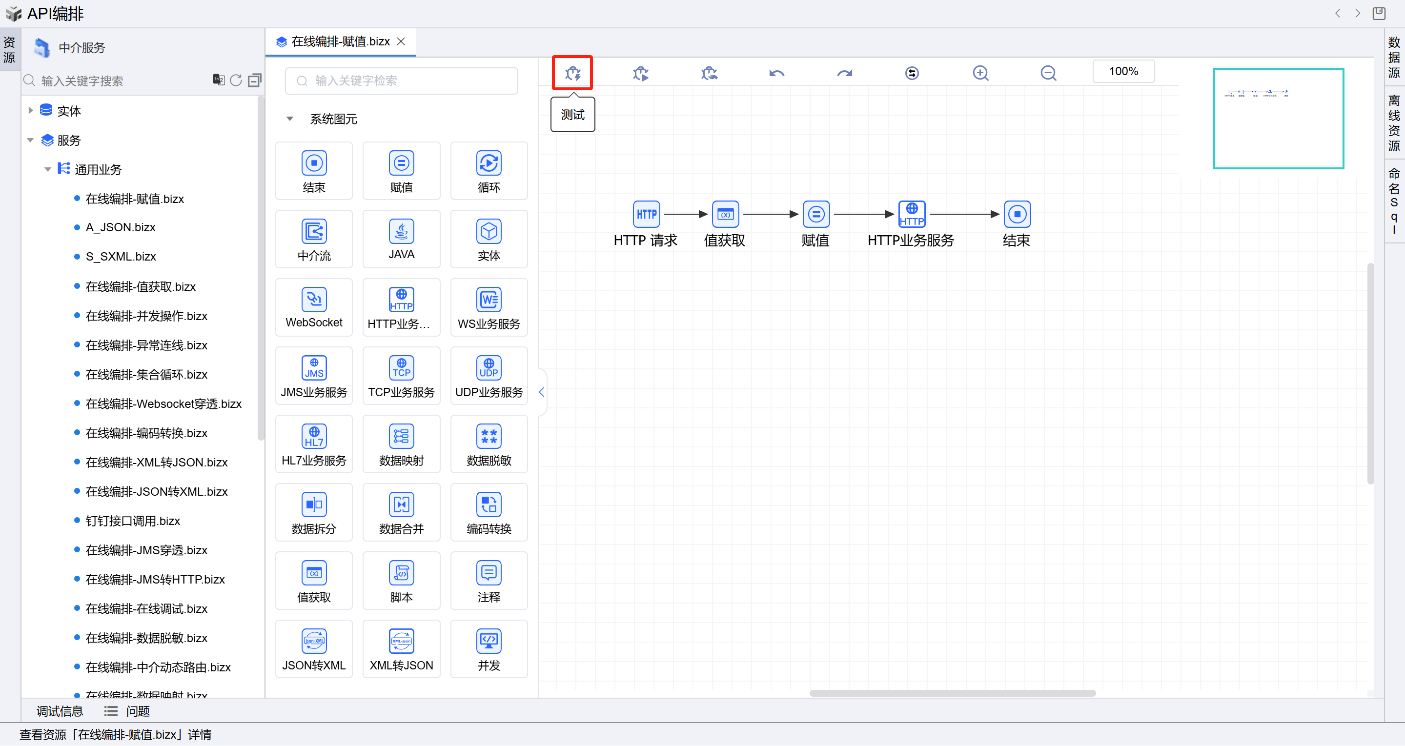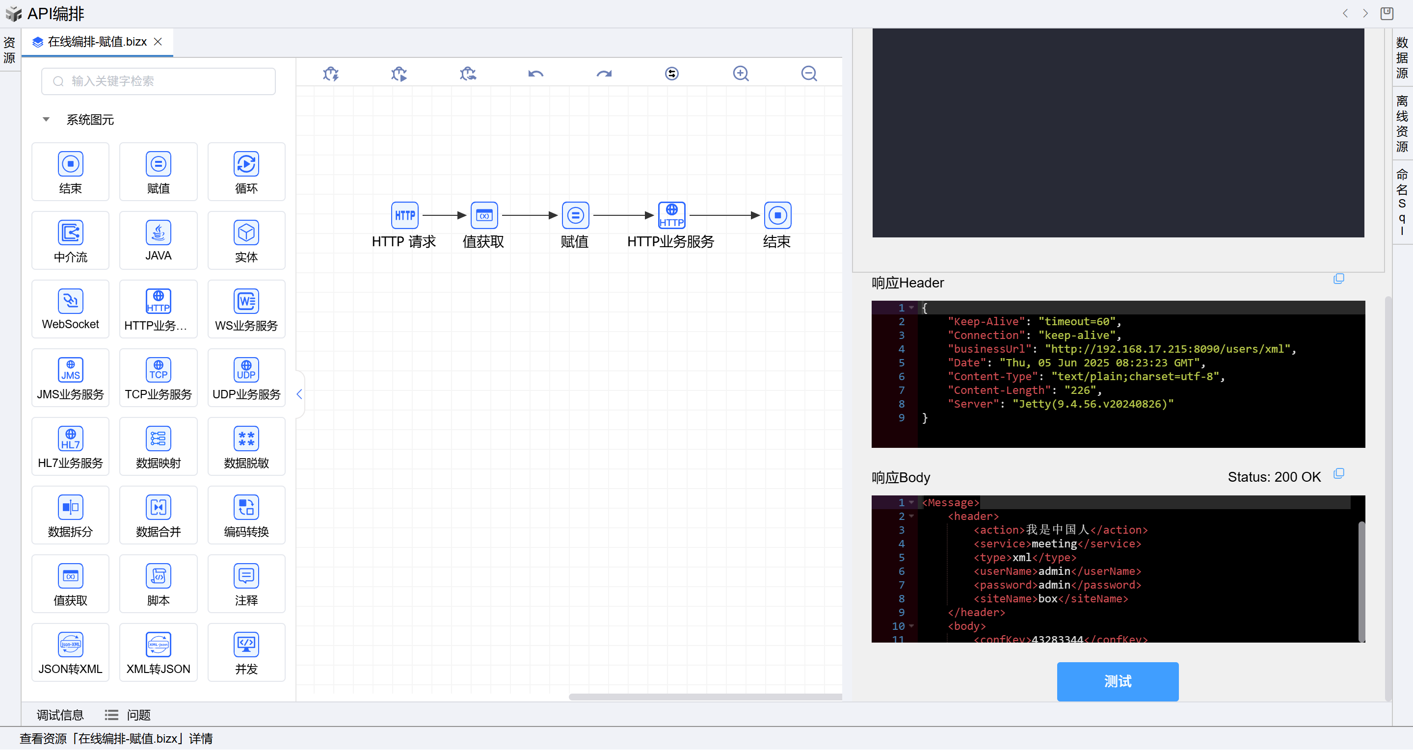 在线编排页面保存成功后,点击界面上方的测试按钮,如下图: