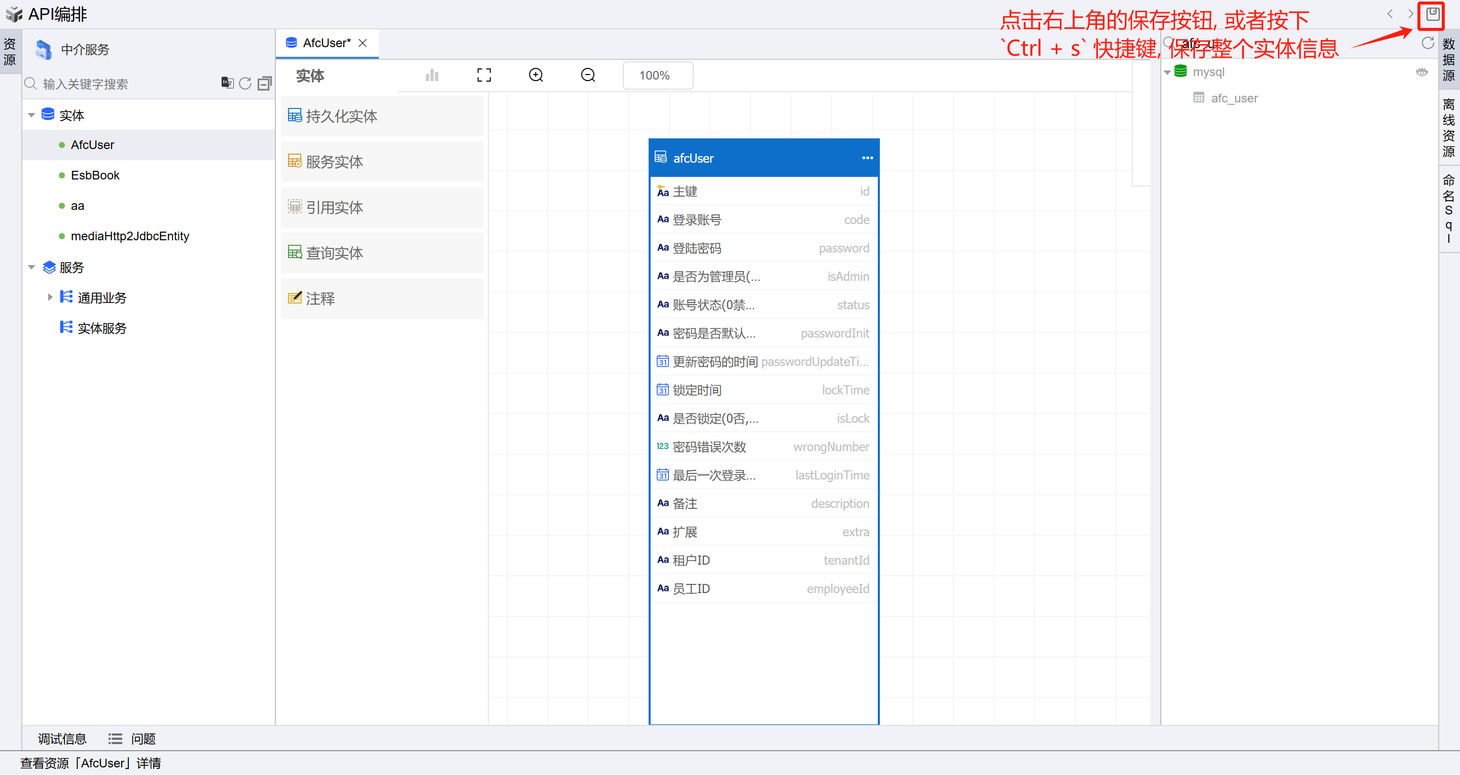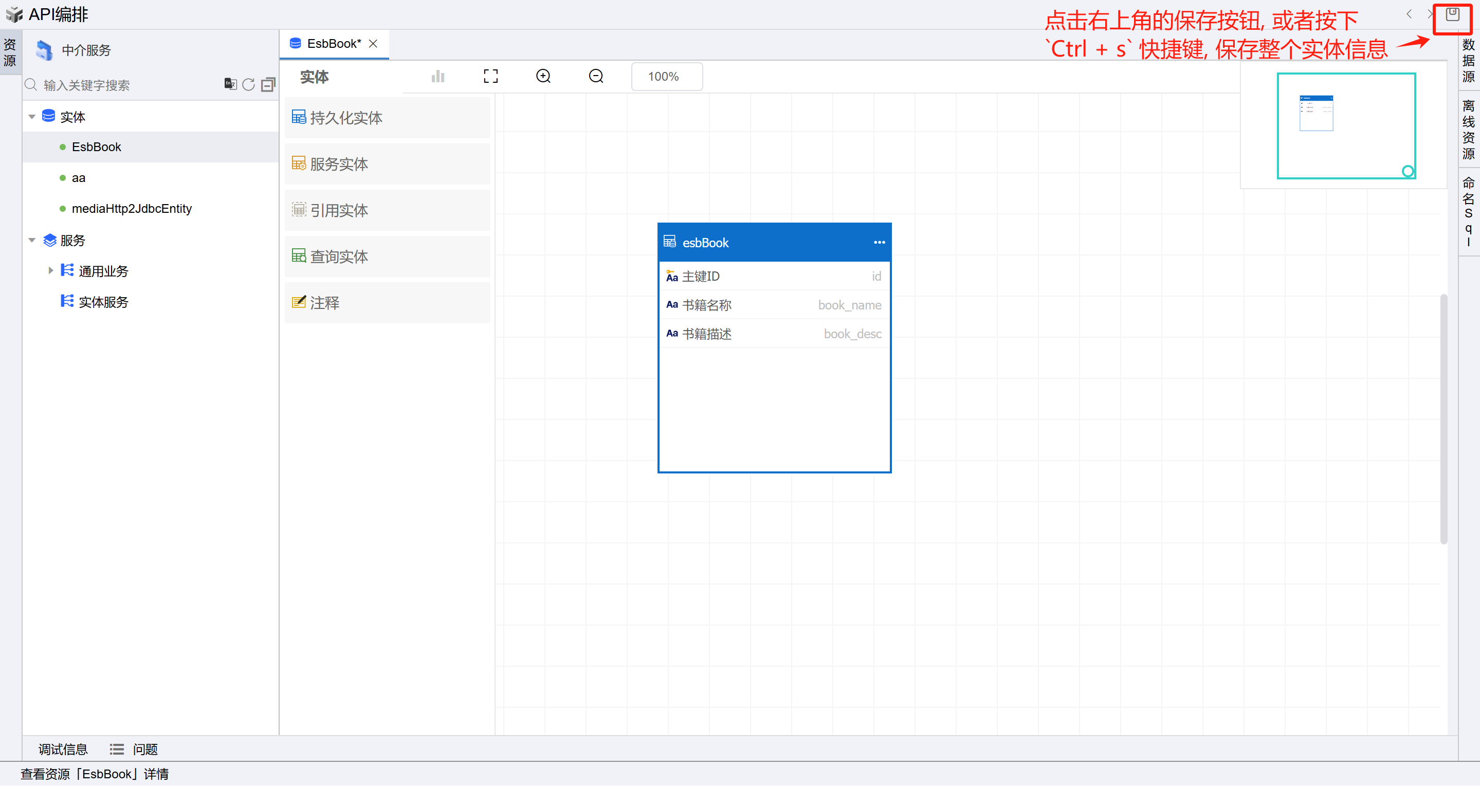 - 在实体创建页面中,从左侧拖动”持久化实体“到画布上。如下图: