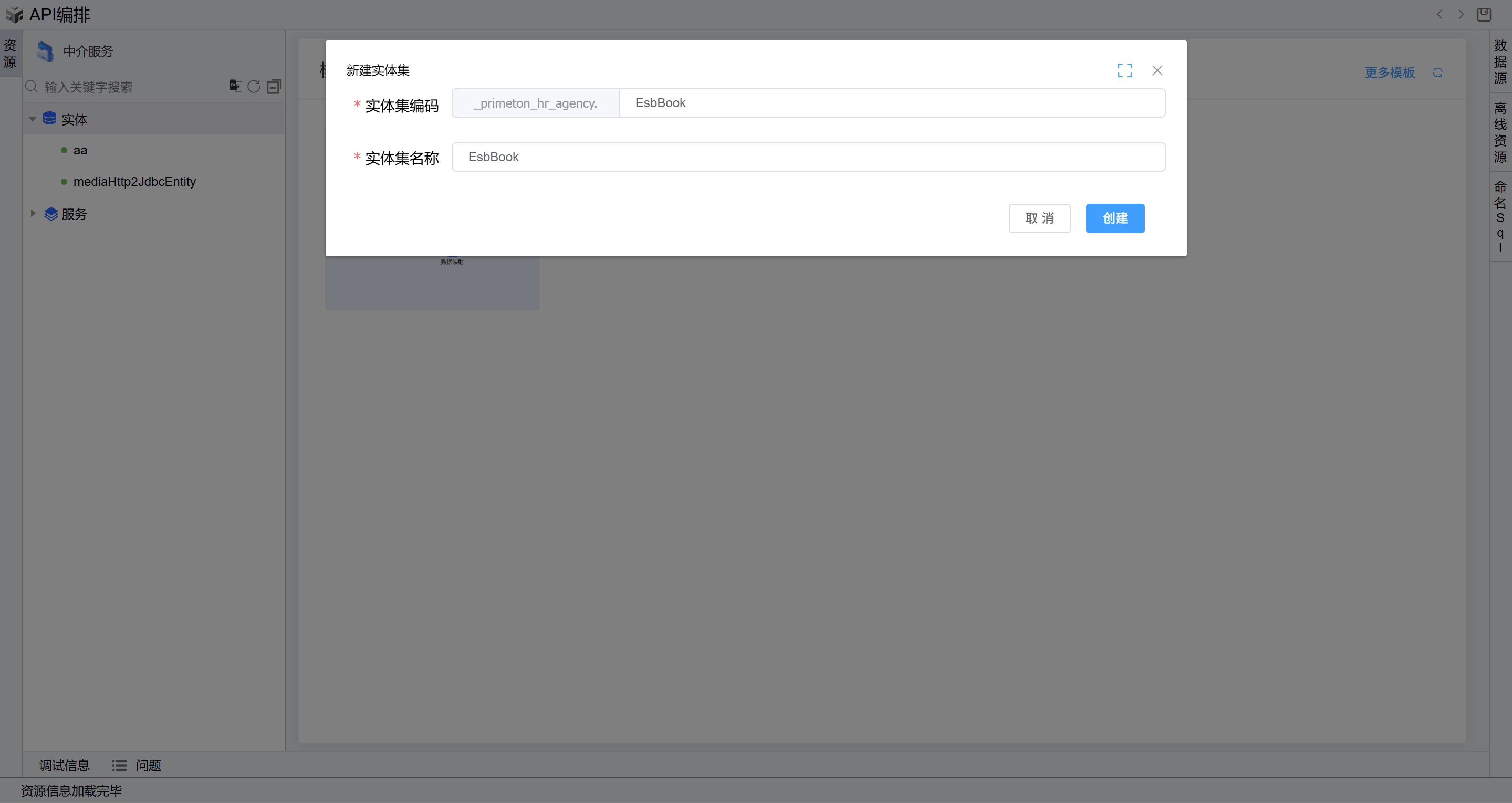 - 在实体集创建页面中,输入实体集编码,实体集名称,点击”创建“按钮,完成实体集创建。