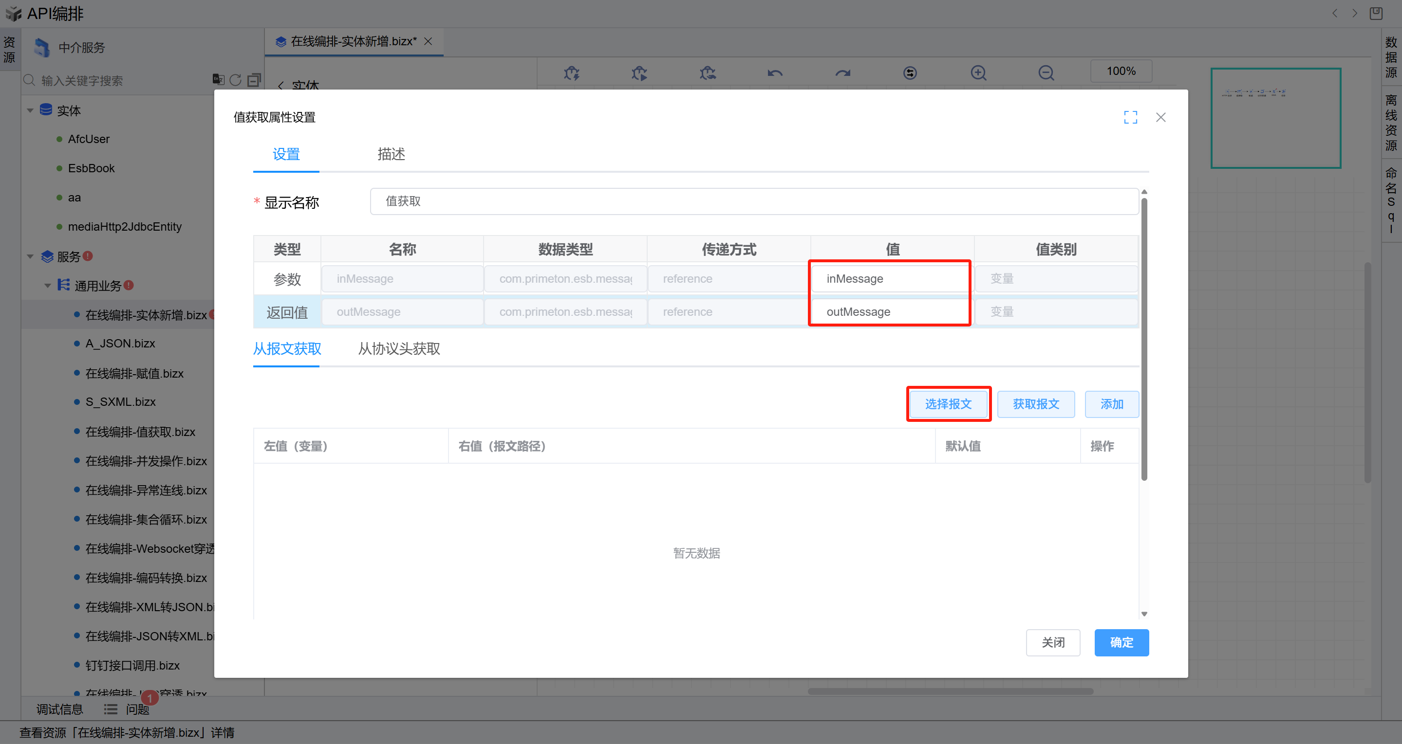 outMessage,返回值选择outMessage,默认是“从报文获取“页签,点击右侧的“选择报文“按钮。如下图: