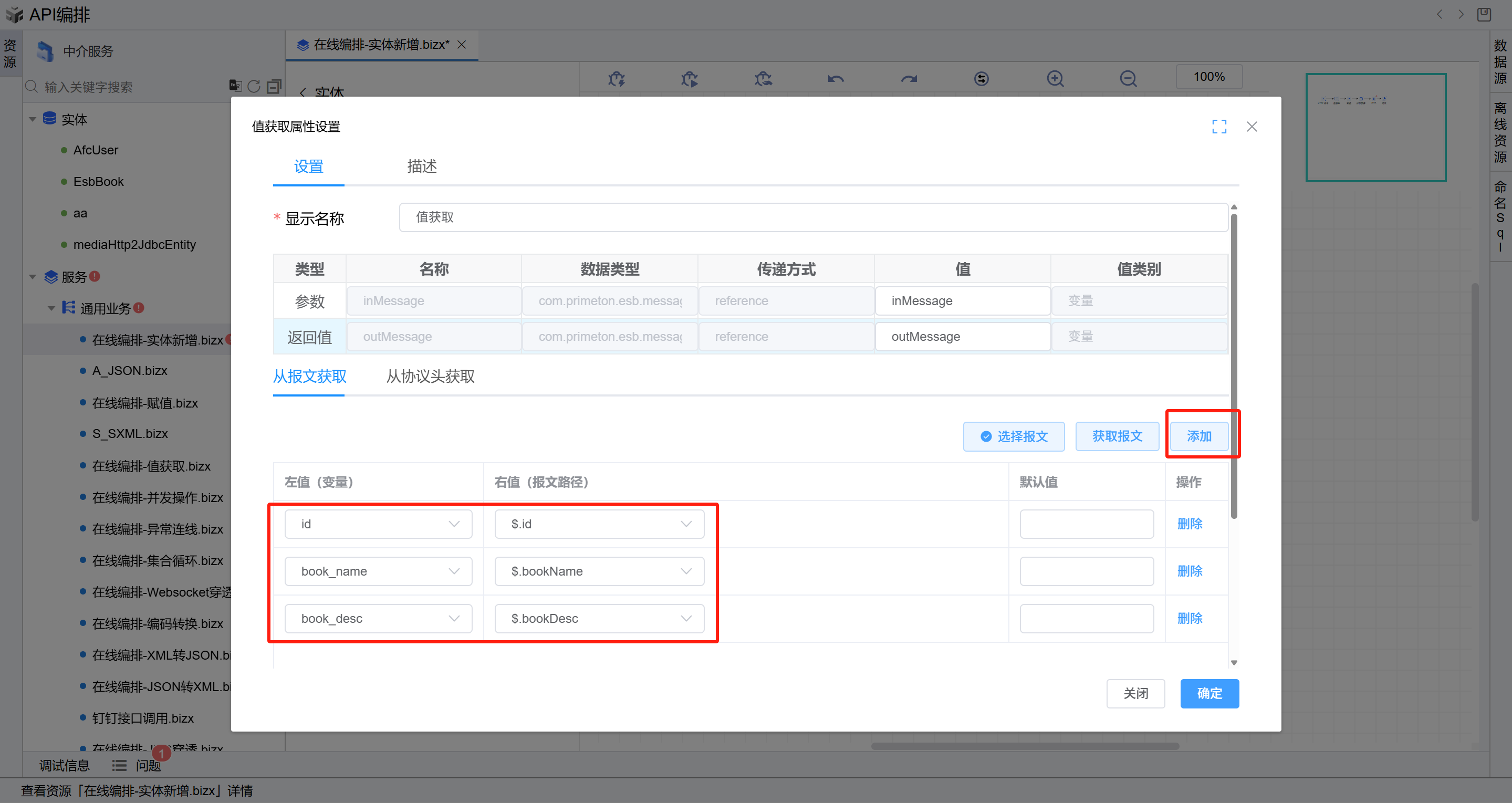 id、book_name、book_desc, 右值下拉选择报文中对应的字段即可,点击“确定”按钮保存