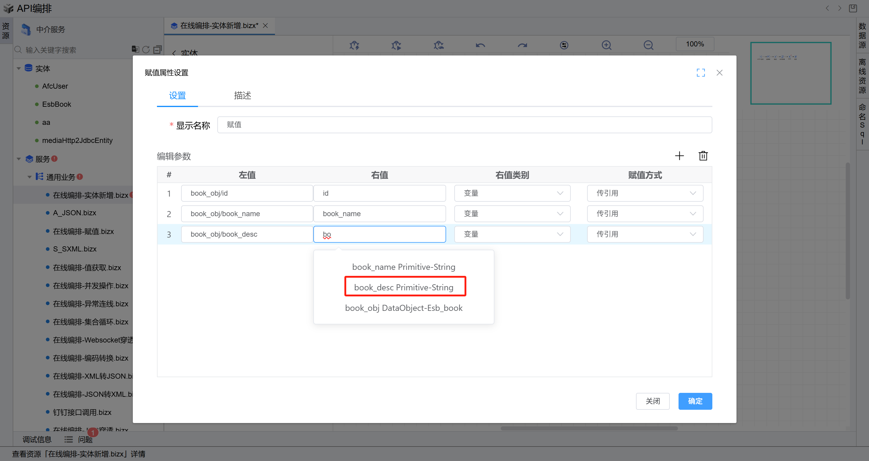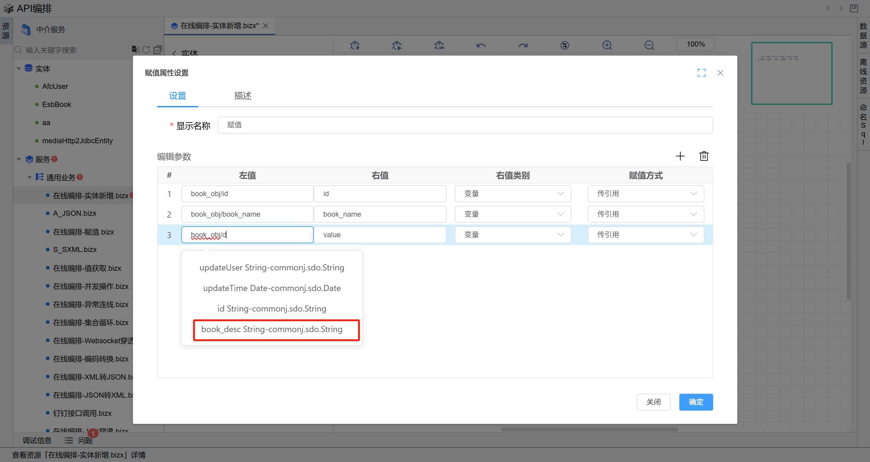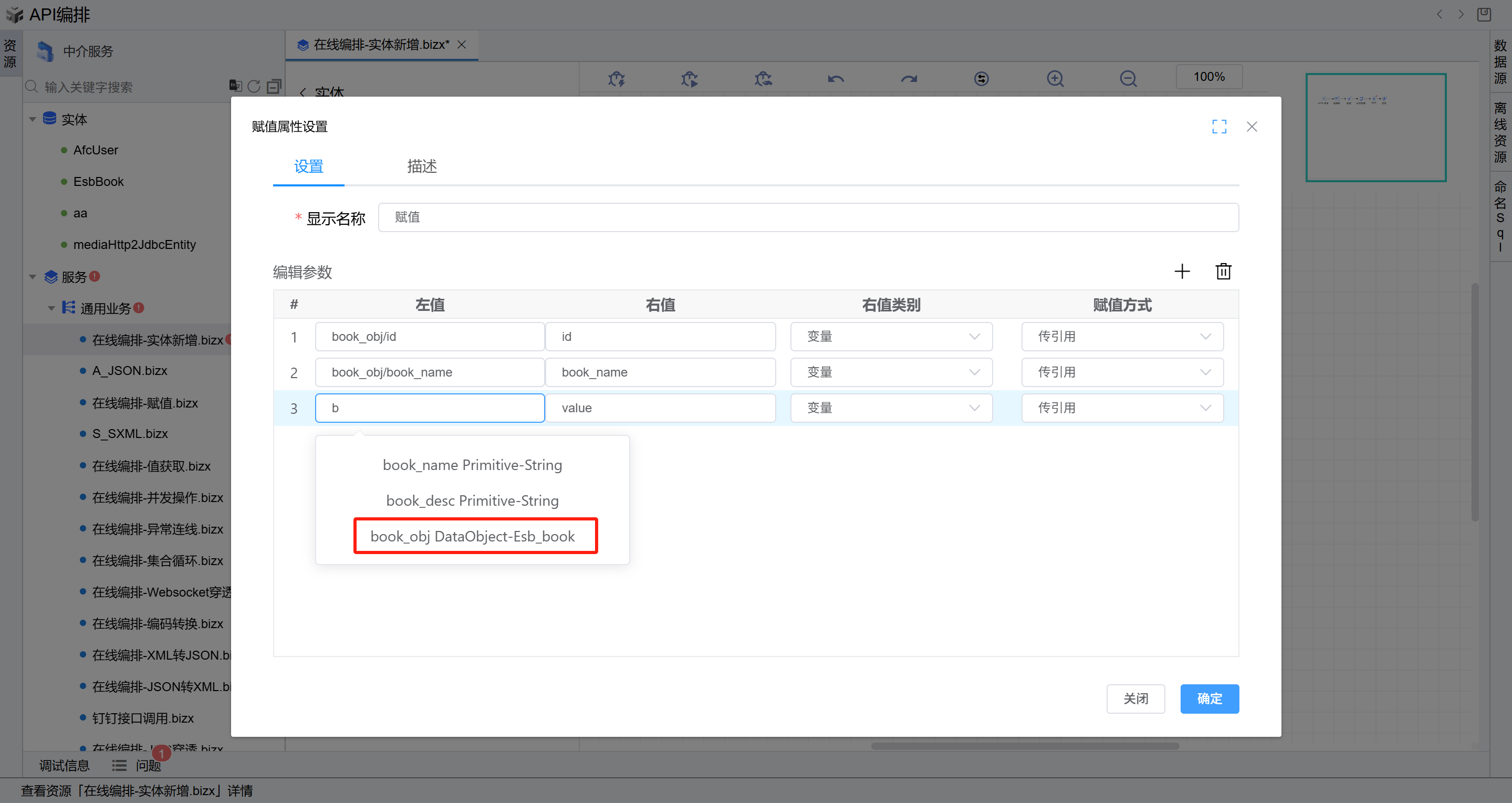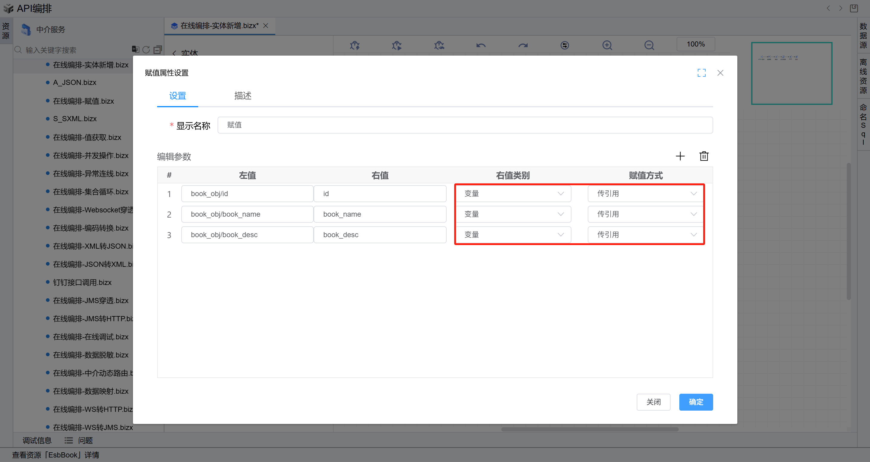 book_obj/id(输入技巧:先输入book,选择book_obj,然后输入\,选择id),在“右值“列输入id,右值类型选择“变量“, 编辑第二行参数,在“左值“列下拉选择定义的变量book_obj/book_name,在“右值“列输入book_name,右值类型选择“变量“, 编辑第三行参数,在“左值“列下拉选择定义的变量book_obj/book_desc,在“右值“列输入book_desc,右值类型选择“变量“, 点击“确定”按钮保存。此操作的目的是将从报文头获取相关字段赋值给实体属性。如下图: