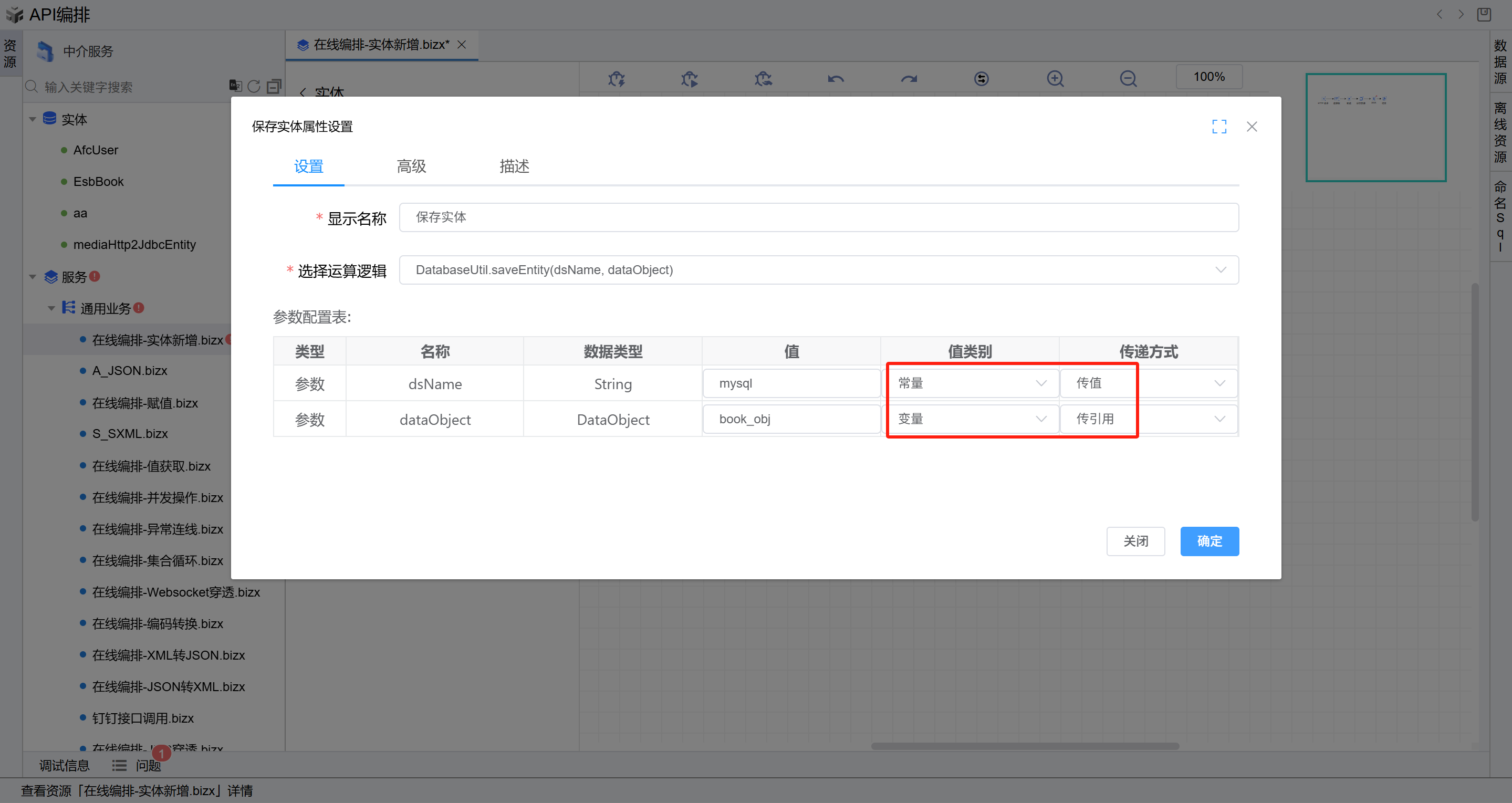 dsName的值填写数据源的编码,值类型选择常量,参数名称为dataObject的值填写实体变量名称book_obj,值类型选择变量,点击“确定”按钮保存。如下图: