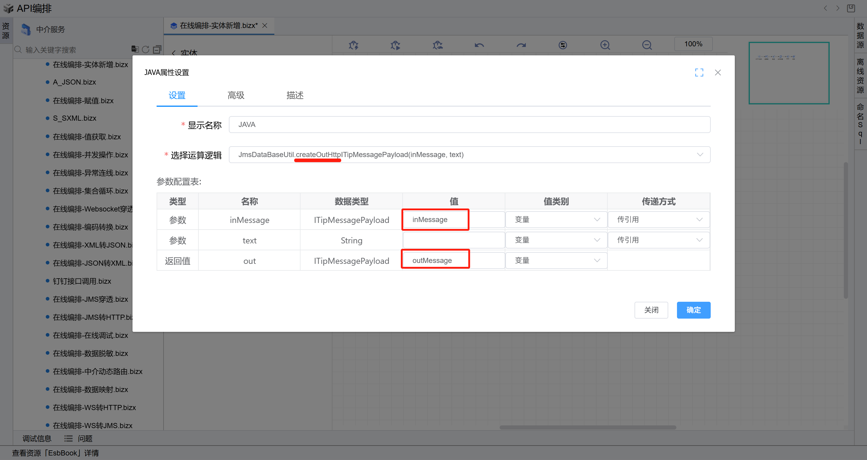 JmsDataBaseUtil.createOutHttpITipMessagePayload,参数名称为inMessage的值填写inMessage, 参数名称为text的值填写可不填写(不填写返回默认数据,填写则返回此自定义数据,自定义字符串时,值类别需选择常量),返回值名称为out的值填写outMessage,点击“确定”按钮保存。如下图:
