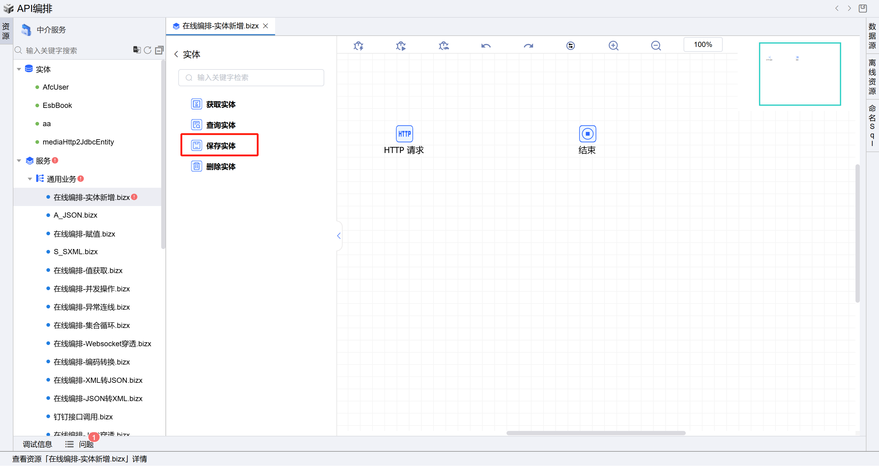 - 选择左侧树上中介服务节点,点击API创建按钮,选择右侧的”API编排“页签,点击”API编排“按钮,进入在线编排页面。