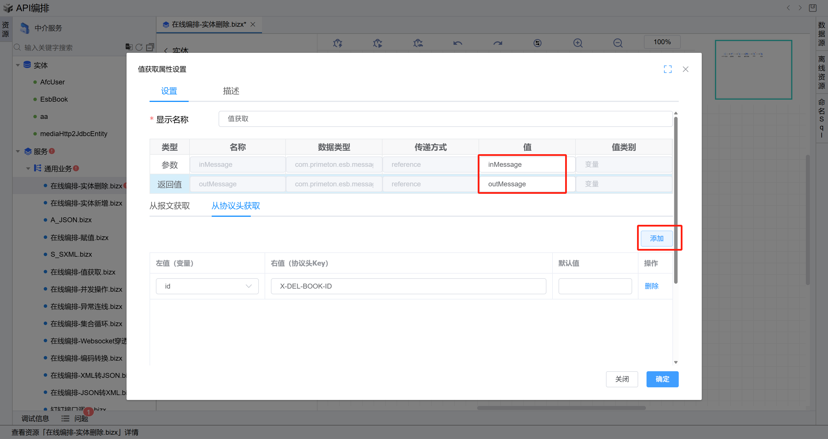 outMessage,返回值选择outMessage,选择“从协议头获取“页签,点击右侧的“添加“按钮,添加变量id, 从报文头获取id的key为X-DEL-BOOK-ID,点击“确定”按钮保存。如下图: