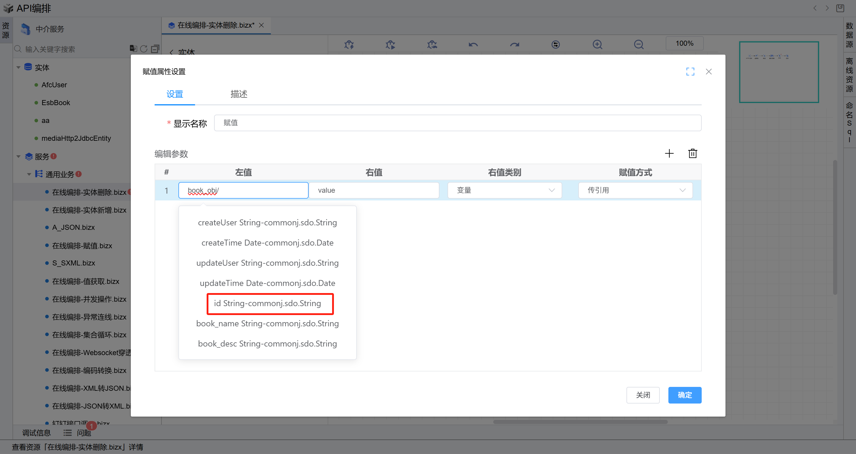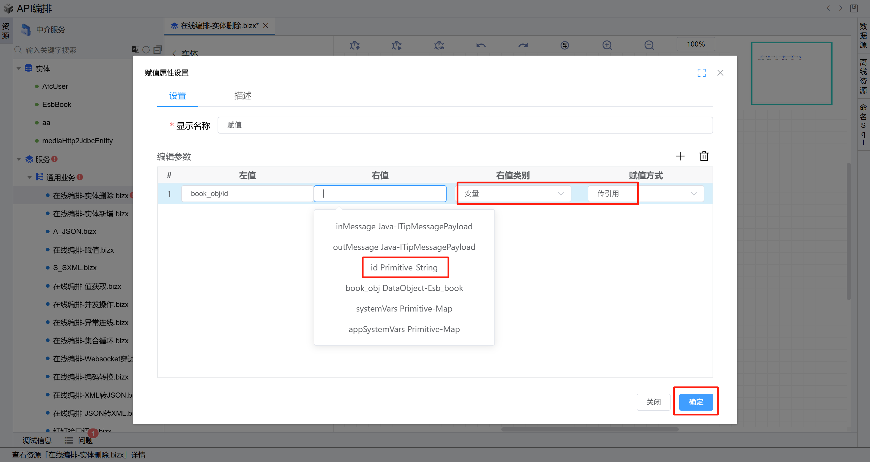 book_obj/id(输入技巧:先输入book, 选择book_obj,然后输入\,选择id),在“右值“列输入值获取图元返回的变量id,右值类型选择“变量“, 点击“确定”按钮保存。此操作的目的是将从报文头获取相关字段赋值给实体属性。如下图: