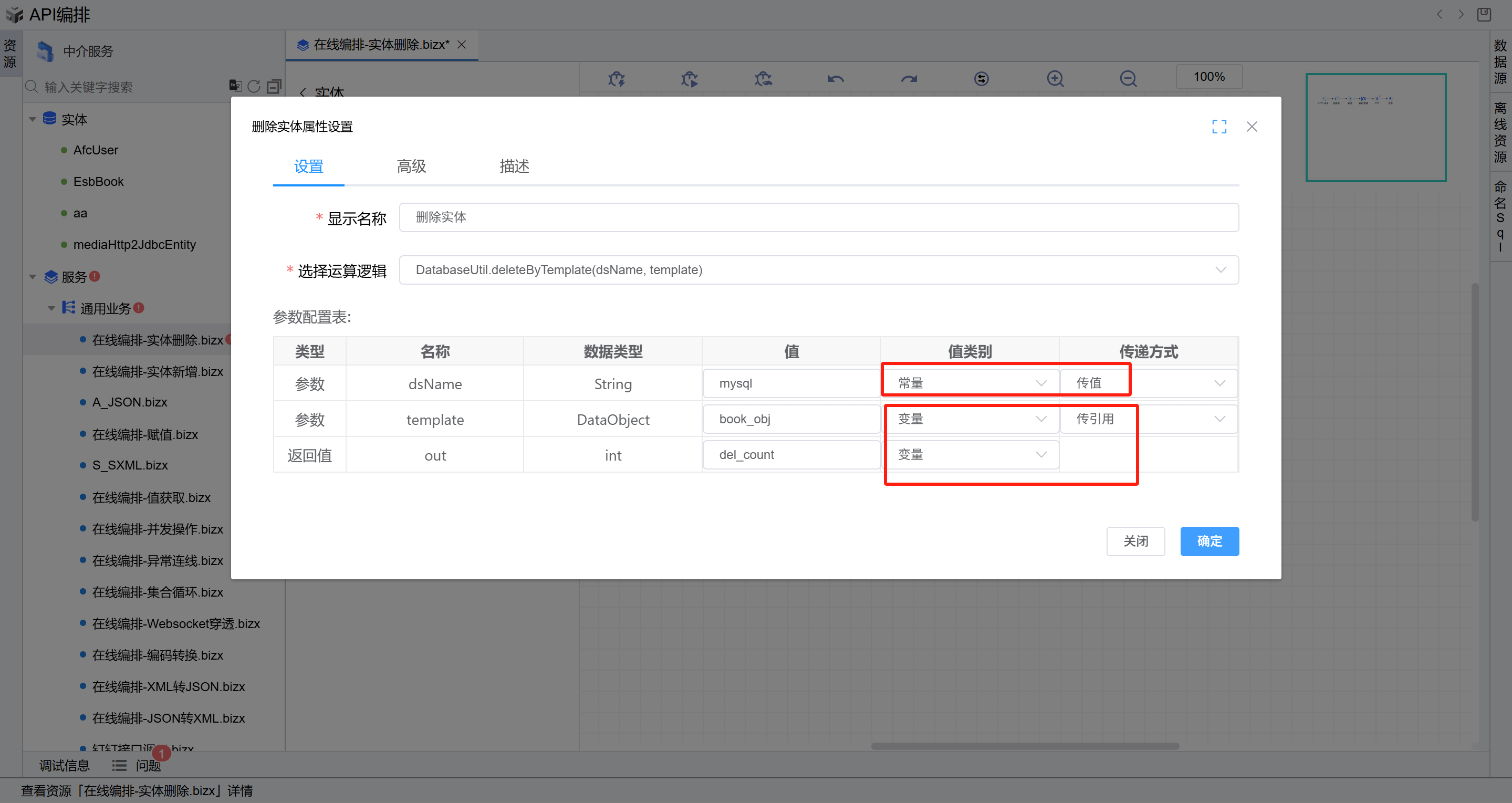dsName的值填写数据源的编码,值类型选择常量,参数名称为dataObject的值填写实体变量名称book_obj, 参数名称为template的值填写实体变量名称book_obj,值类型选择变量,返回值名称为out的值填写实体变量名称del_count,值类型选择变量,点击“确定”按钮保存。如下图: