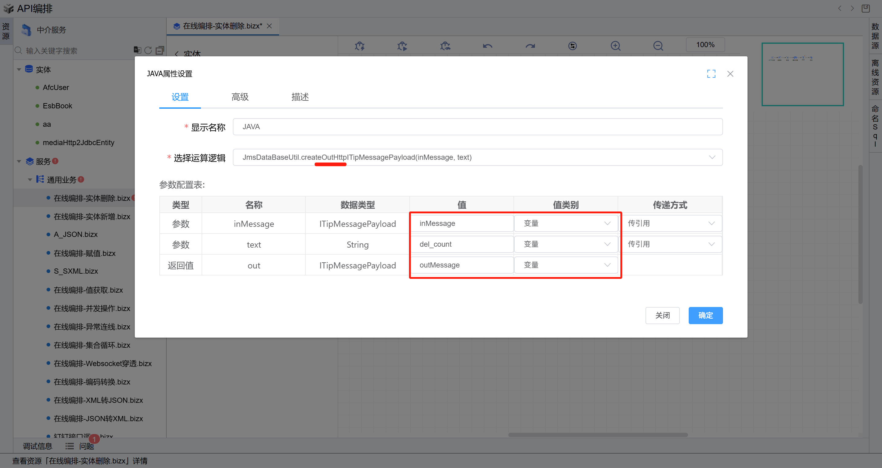 JmsDataBaseUtil.createOutHttpITipMessagePayload(inMessage, text),参数名称为inMessage的值填写inMessage, 参数名称为text的值填写del_count,返回值名称为out的值填写outMessage,所有值类型选择变量,点击“确定”按钮保存。如下图: