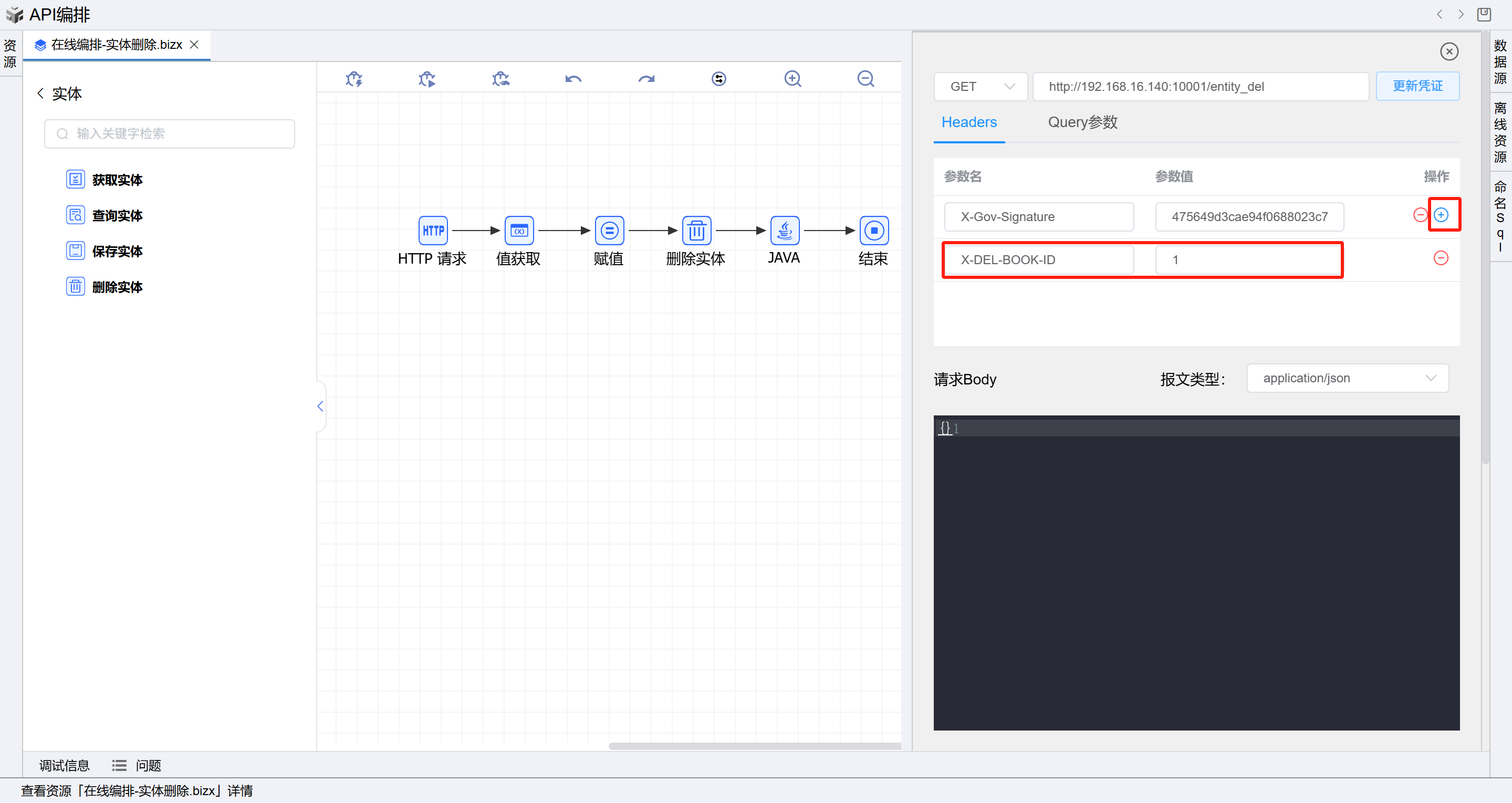 GET,新增请求头参数X-DEL-BOOK-ID的值填写删除的实体id1,点击测试,返回1表明根据id删除1条数据成功。如下: