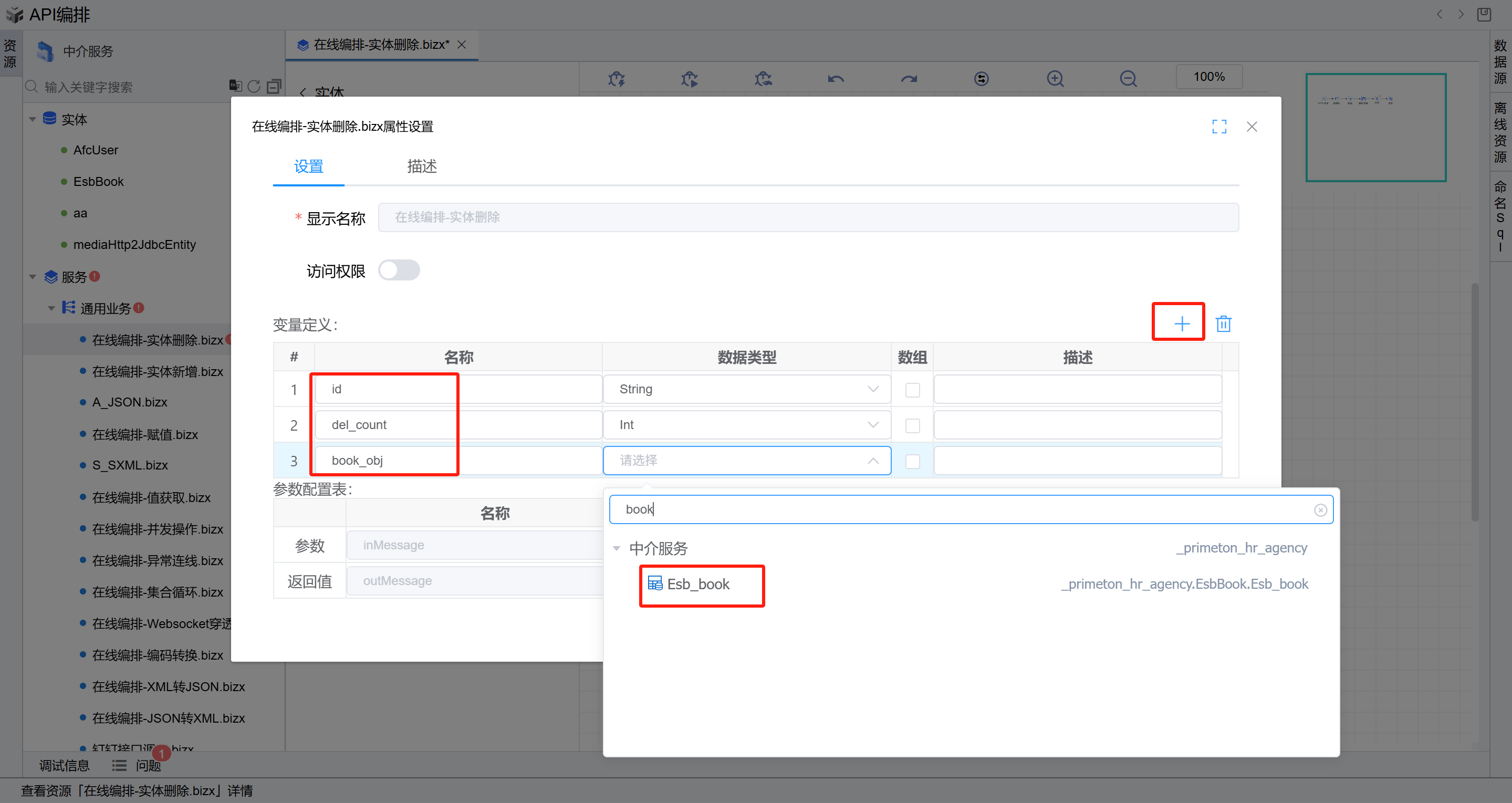 - 选择左侧树上中介服务节点,点击API创建按钮,选择右侧的”API编排“页签,点击”API编排“按钮,进入在线编排页面。