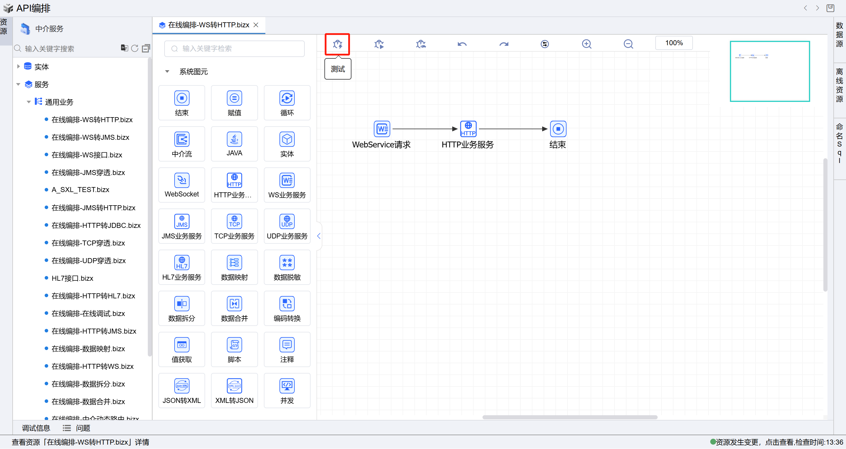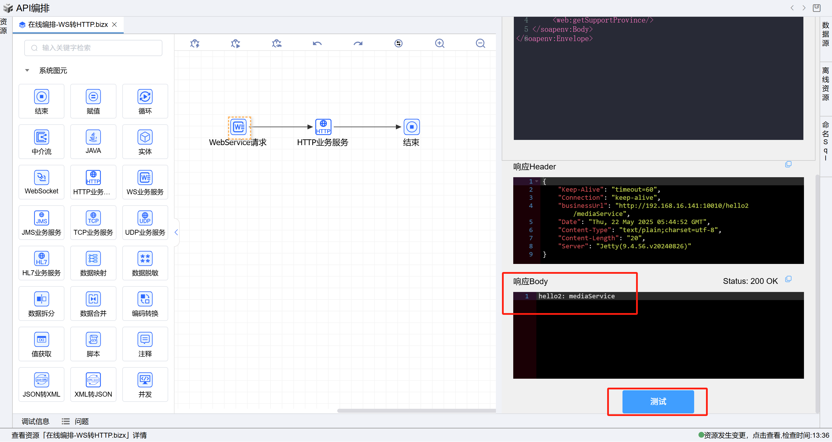 在线编排页面保存成功后,点击界面上方的测试按钮,如下图: