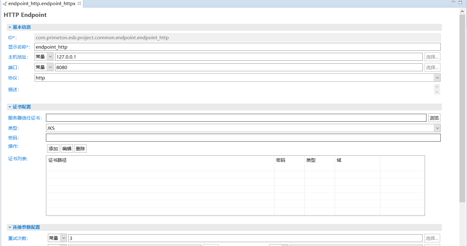 - 文件名:用于存储HTTP Endpoint配置的文件名。需要保证在ESB工程中唯一。