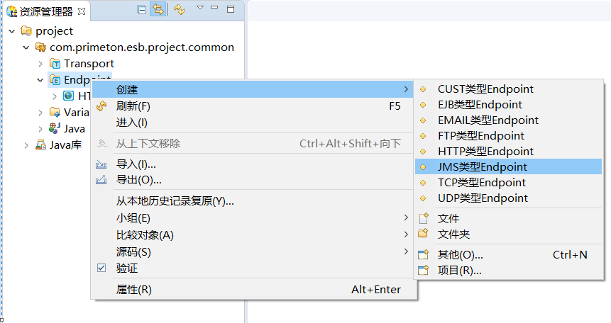 在资源管理器中,右键点击公共Module中"Endpoint",选择"创建->JMS类型Endpoint"菜单项,如下所示: