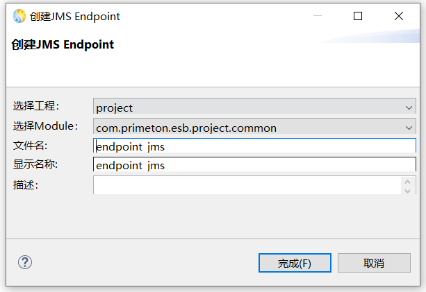 在弹出的"创建JMS类型Endpoint"向导中,选择当前的工程、Module,并输入文件名及显示名称,点击"完成"按钮,如下: