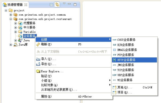 在资源管理器中右键点击业务Module中的"业务服务",选择"创建->HTTP业务服务" 菜单项。