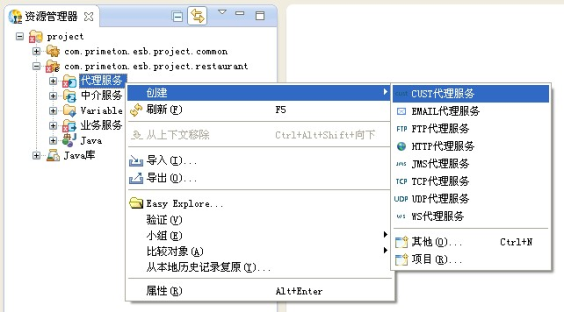 1. 在资源管理器中,右键点击业务Module的代理服务项,在弹出的菜单中选择"创建->CUST代理服务",如下图所示: