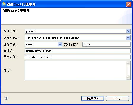 2. 弹出"创建CUST代理服务"窗口,如下图所示,填写类别、文件名等信息后,并点击"完成"按钮,生成CUST代理服务。如下图所示: