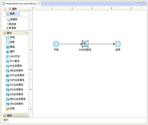 选中WS业务服务图元将此图元拖拽到编辑区,用连接线依次将开始、WS业务服务和结束三个图元连接起来,如下图所示: