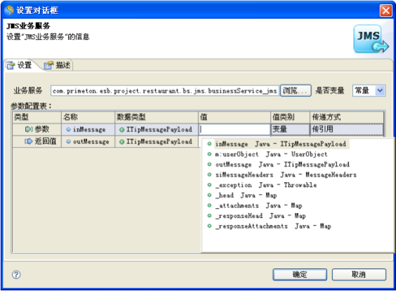 4. 在"设置对话框"窗口中的参数配置表中输入参数和返回值,点击"确定"按钮完成JMS业务服务的参数设置,如下图所示: