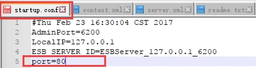 首先,在{ESB Server}/server/EOS/_srv/startup.conf 中定义 port=80,如下图: